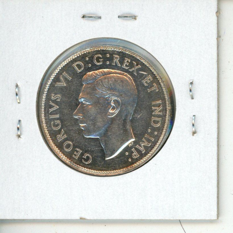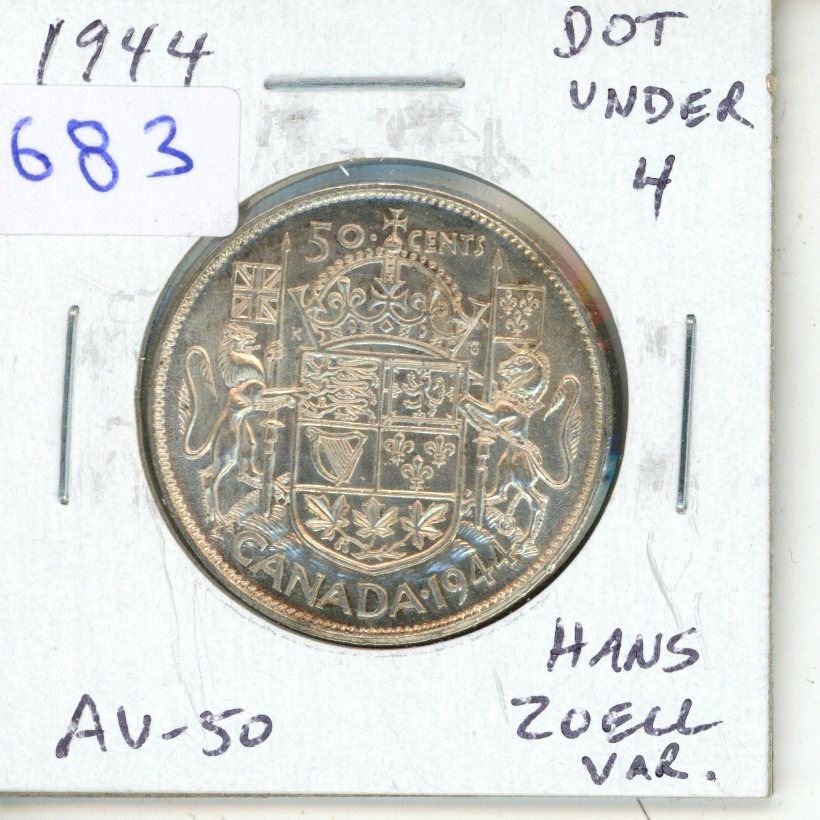 1944 Canadian Silver 50 Cents with Dot under 4 in date. Hans Zoell variety. AU-50. Lustrous.