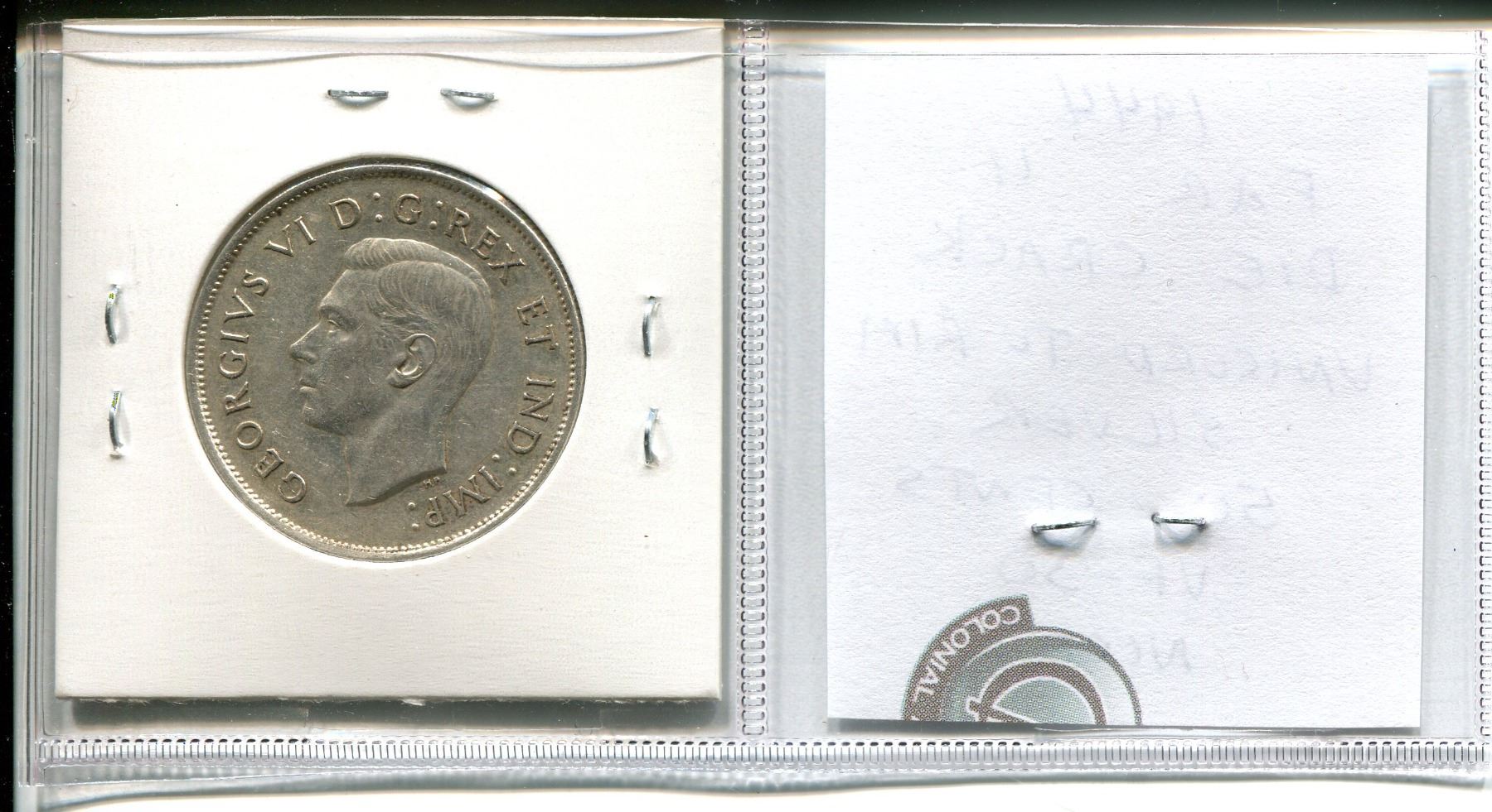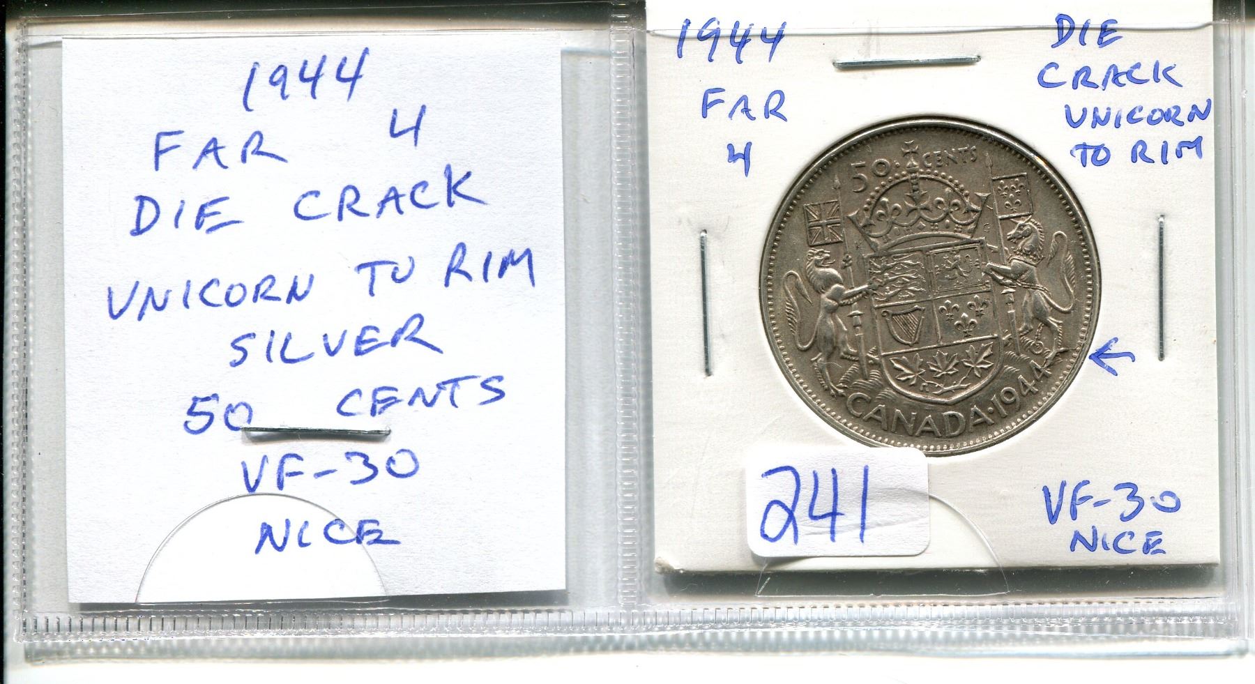 1944 Far 4 Silver 50 cents. Coin displays a Die Crack from the Unicorn to the rim. An interesting and scarce variety. VF-30. Nice.