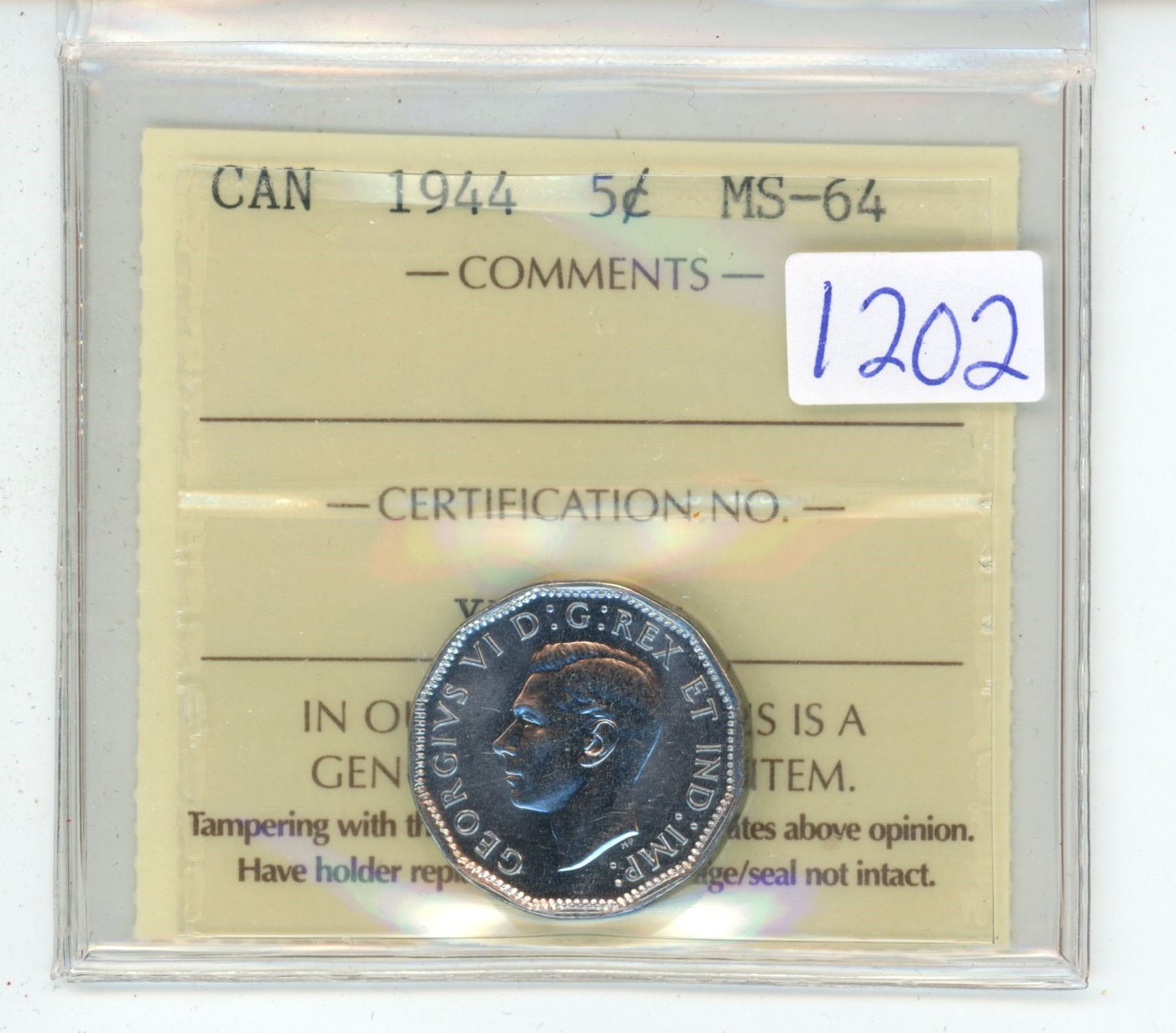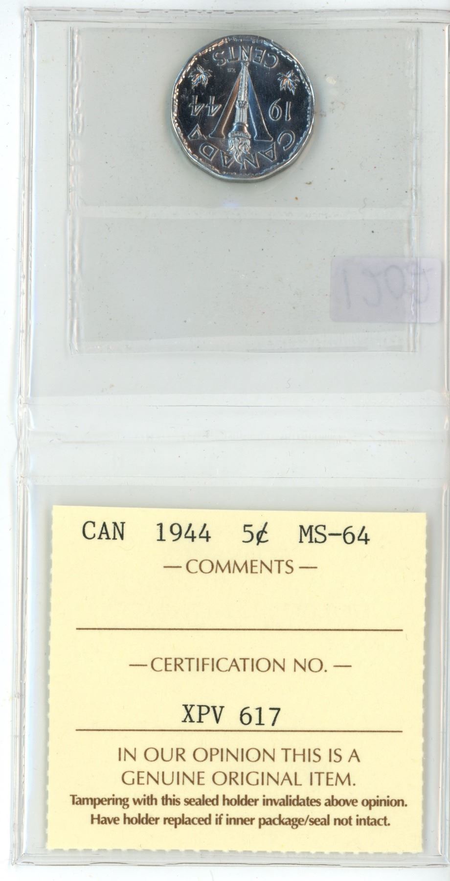 1944 ICCS Graded, Canadian 5 cent nickel coin - MS64