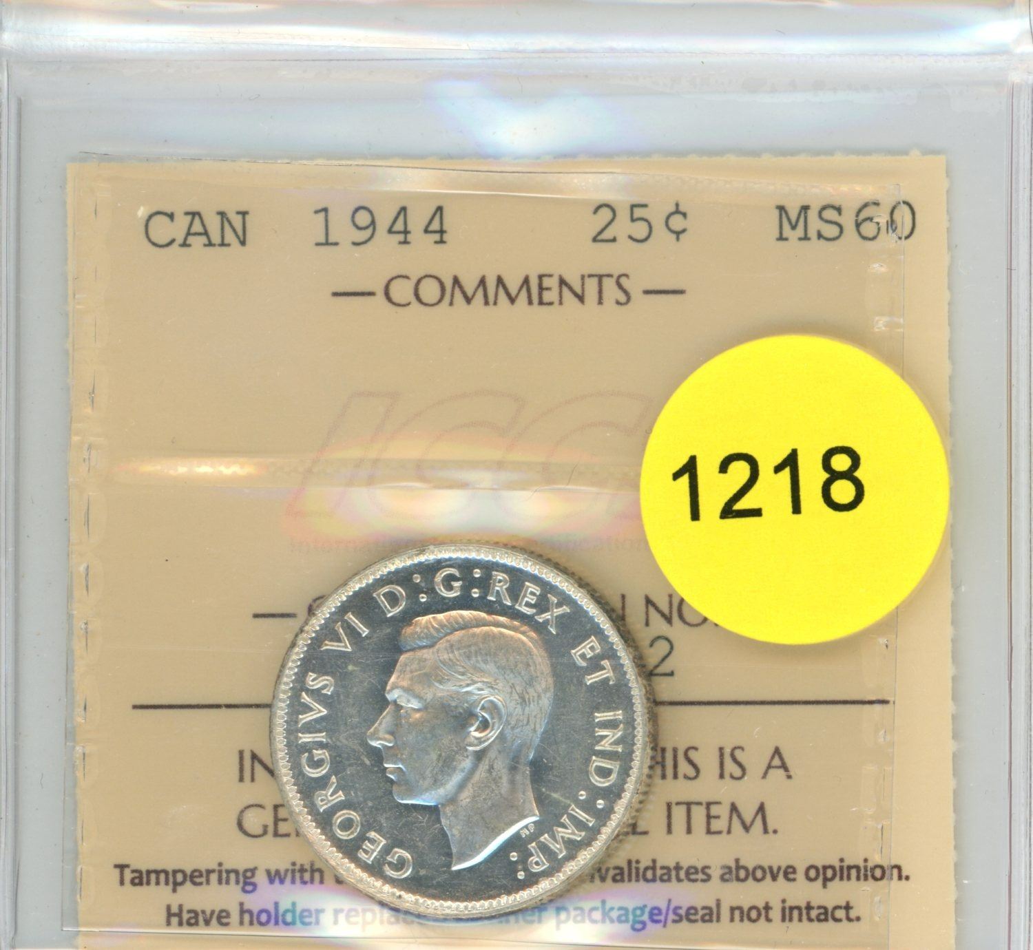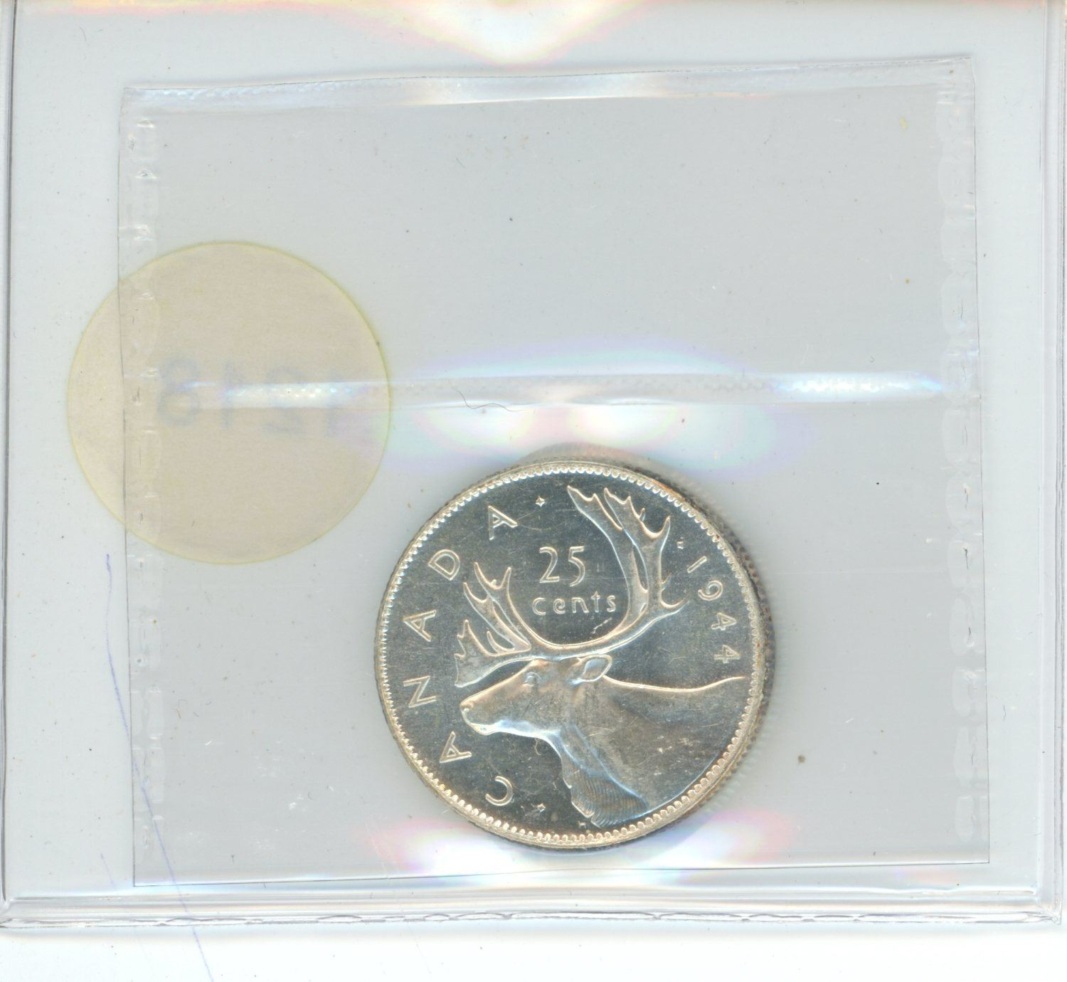 1944 MS60 ICCS Graded Canadian Twenty-Five Cent Coin