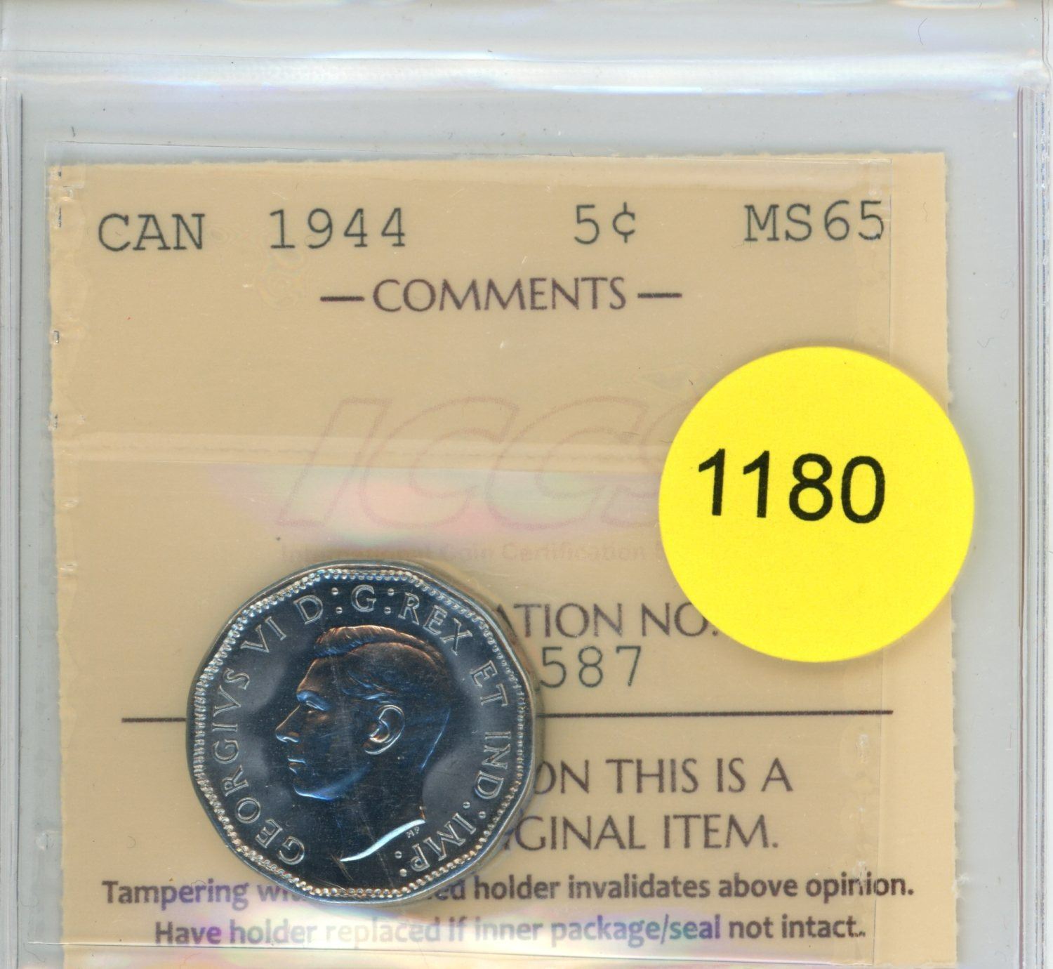 1944 MS65 ICCS Graded Canadian Five Cent Coin