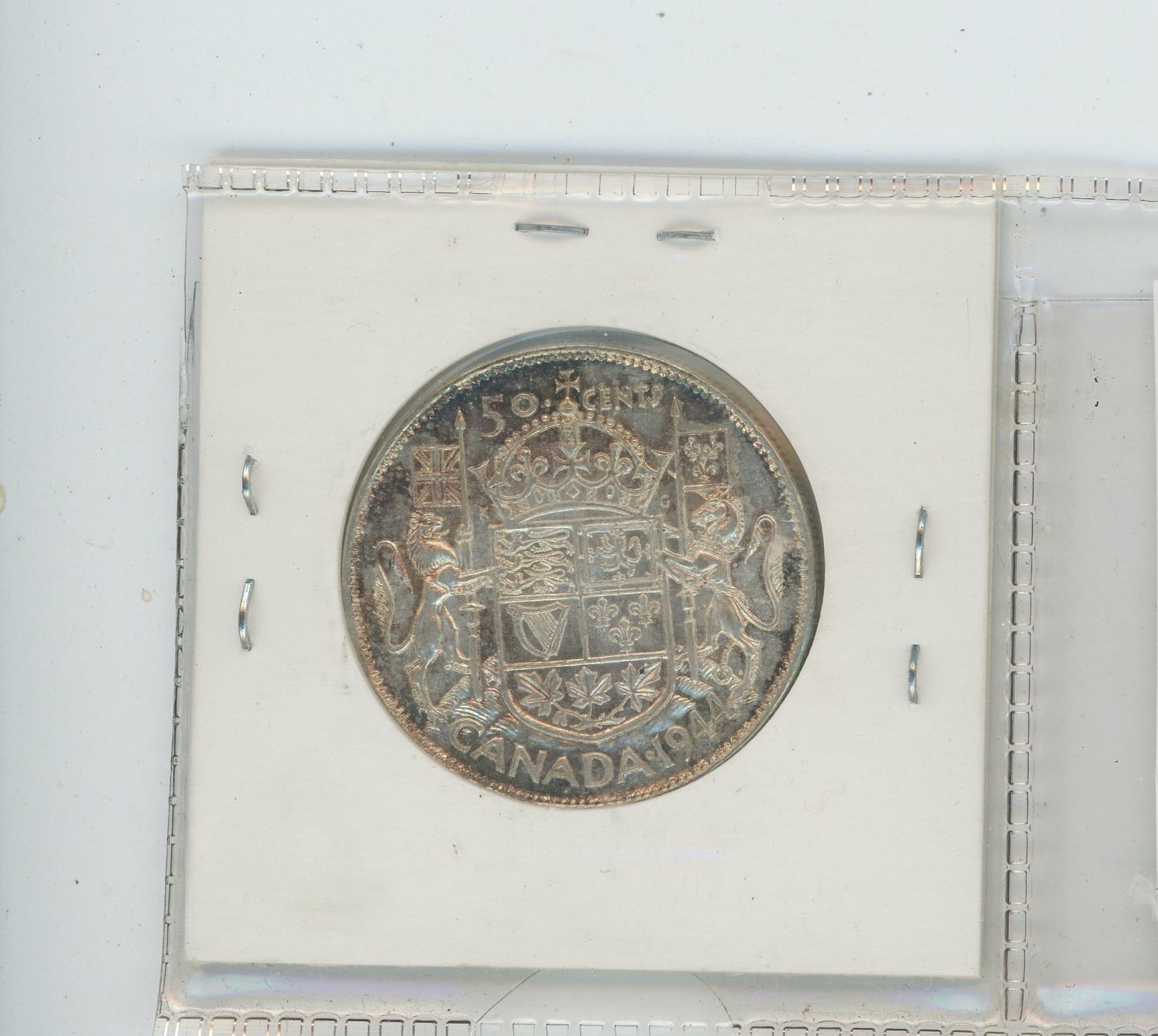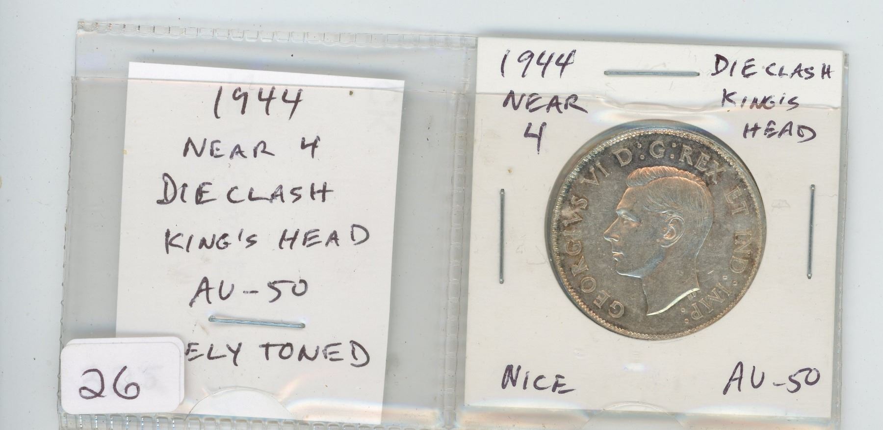 1944 NEAR 4 SILVER 50 CENTS. DIE CLASH IN FRONT OF KING’S HEAD. AU-50. NICELY TONED.