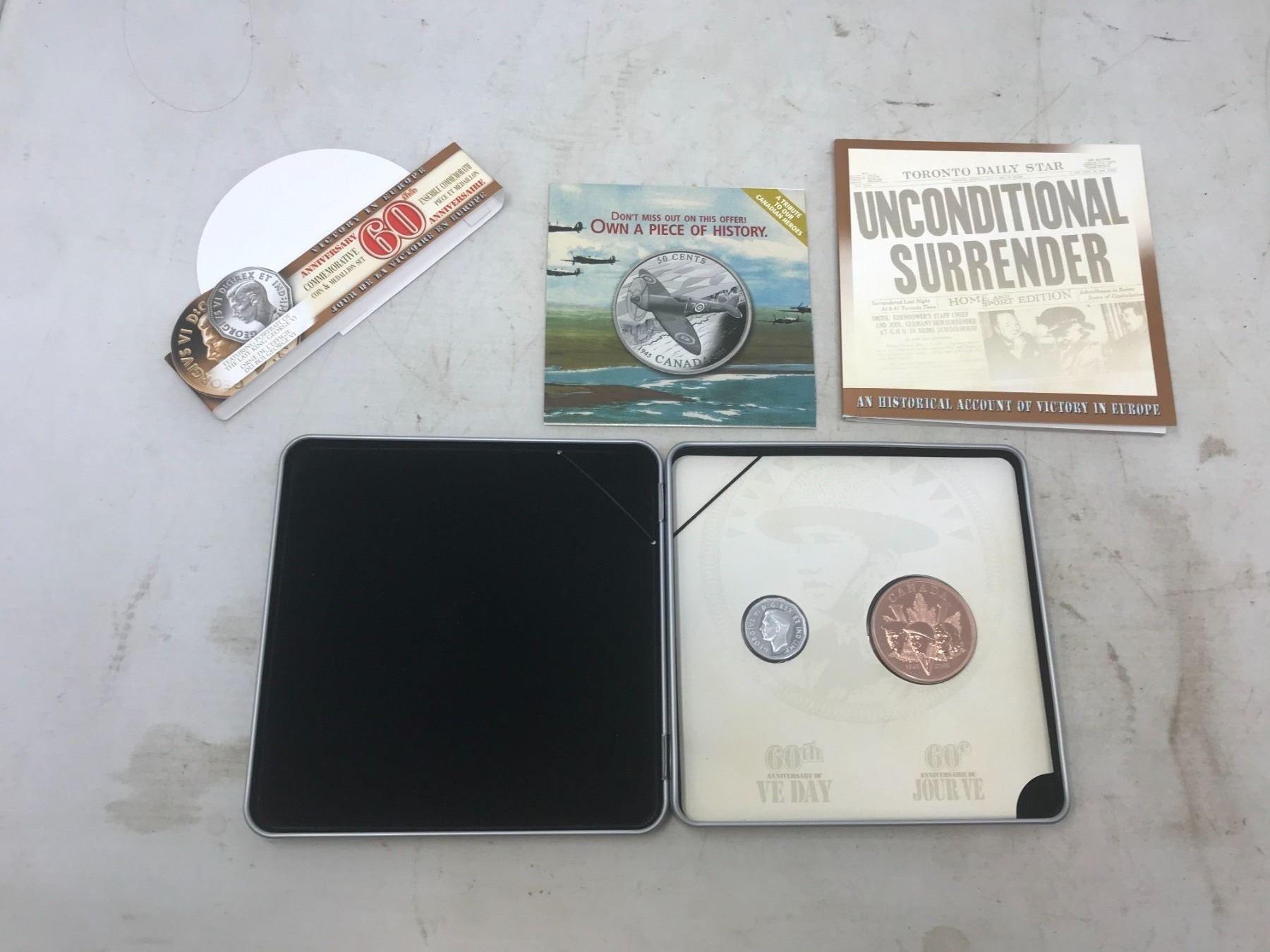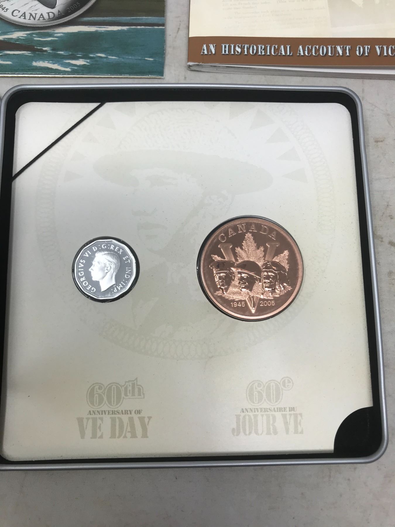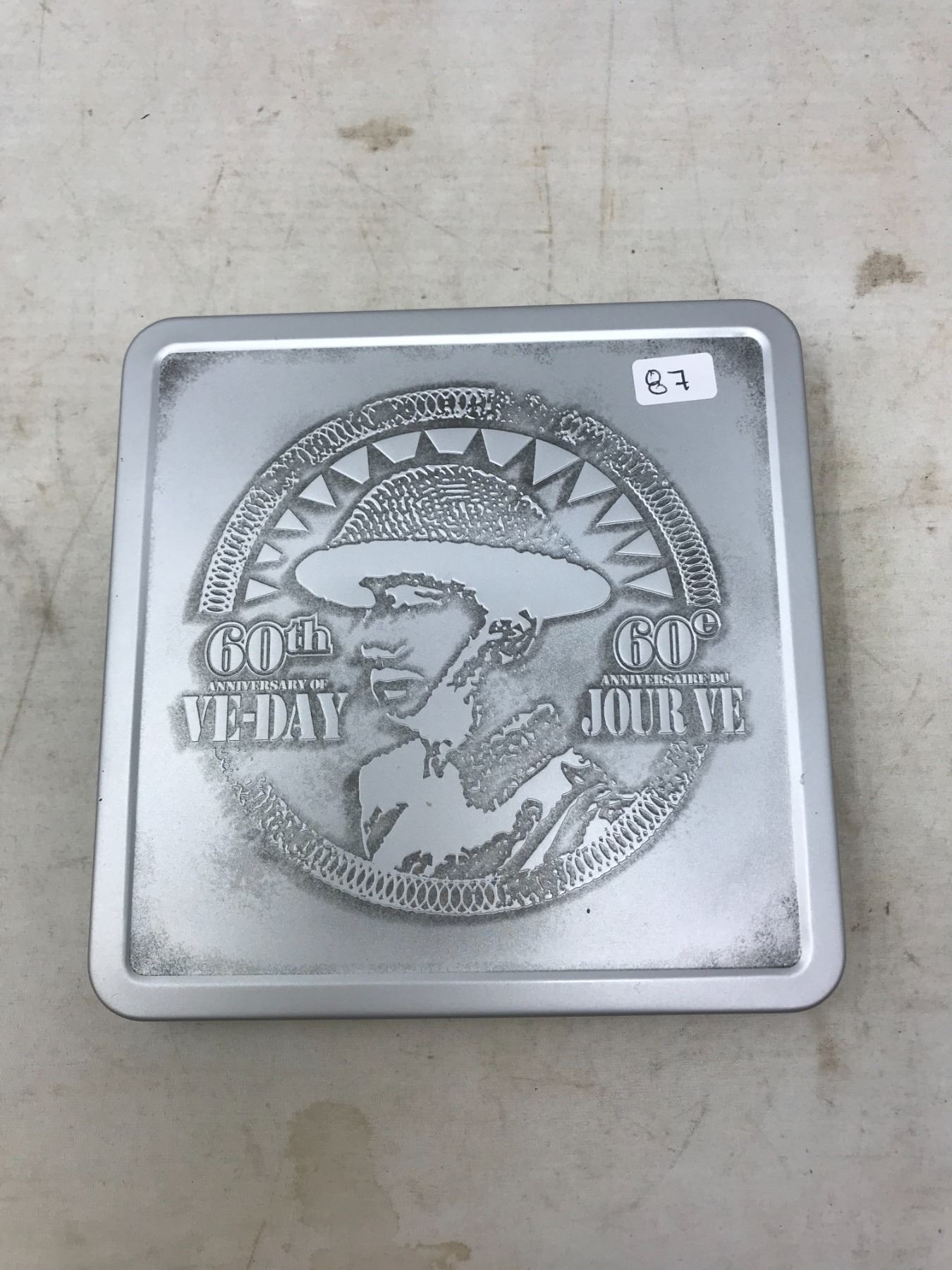 1945-2005 STERLING SILVER VICTORY VE DAY 5 CENTS SET CELEBRATING THE VICTORY OVER NAZI GERMANY IN 1945. INCLUDES LARGE COMMEMORATIVE BRONZE MEDAL DEPICTING NAVY, ARMY & AIR FORCE. PROOF. IN CASE OF ISSUE.