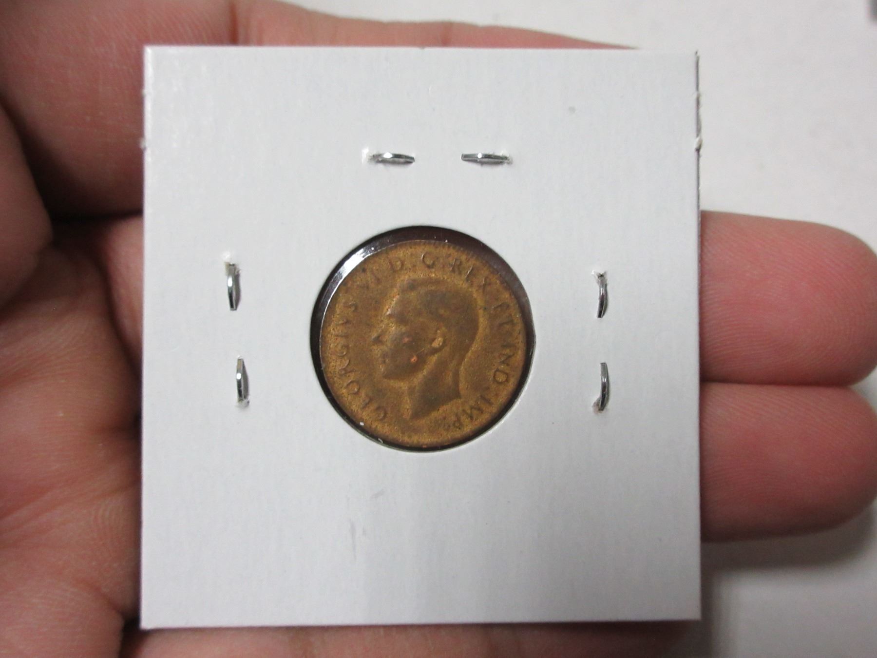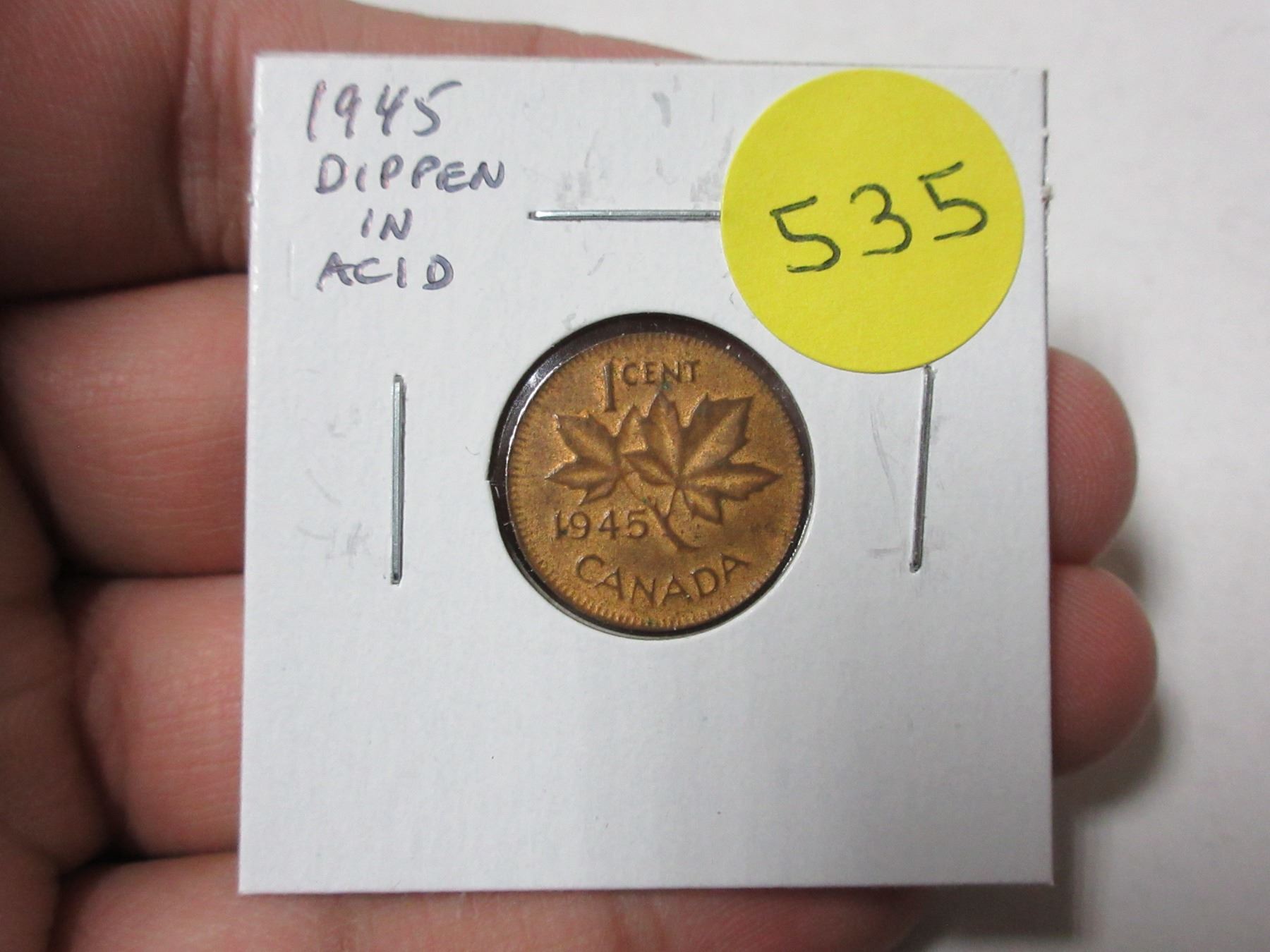 1945 Canadian Small Cent. This coin has been dipped in acid, so it is smaller and thinner than normal.