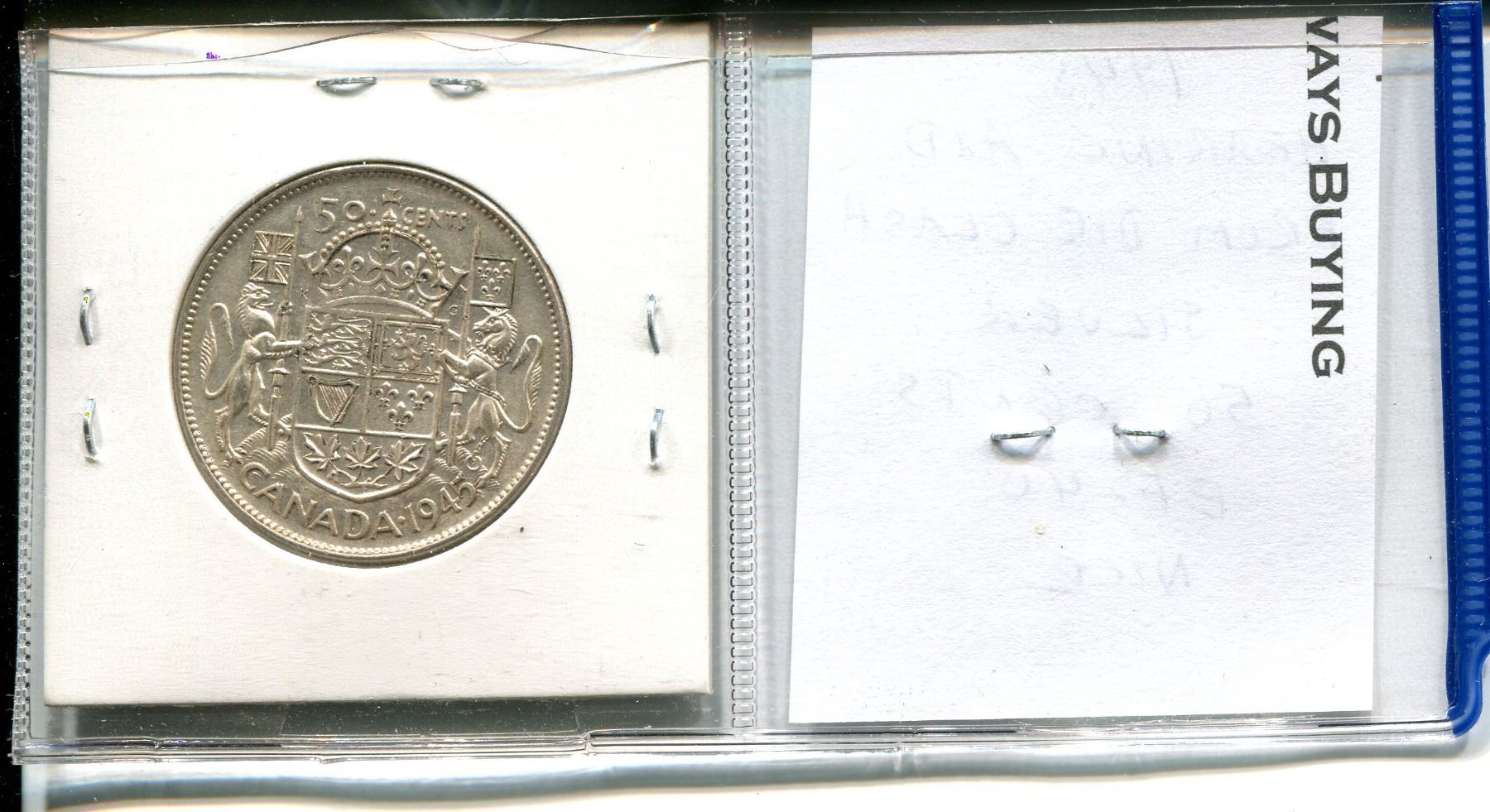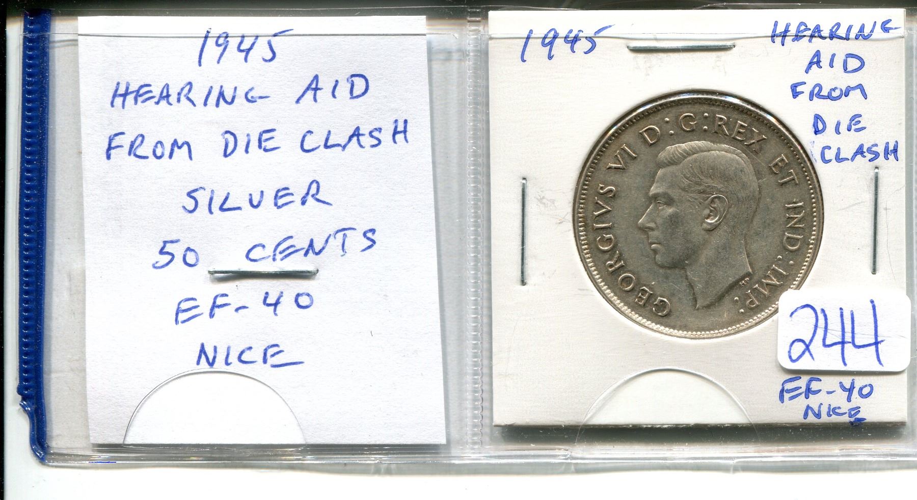 1945 Hearing Aid Silver 50 cents. Hearing Aid in the king’s ear from a Die Clash. An interesting and scarce variety. EF-40. Nice.