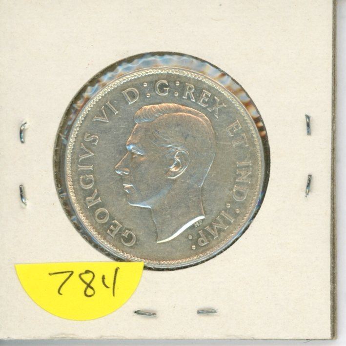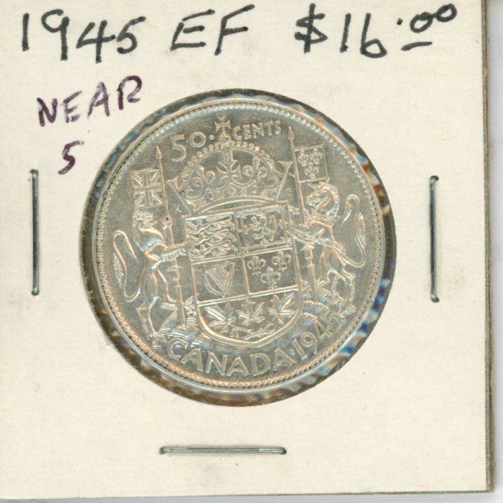1945 Near 5 Canadian Silver 50 Cents. Last year of World War II. EF-40. Nice.