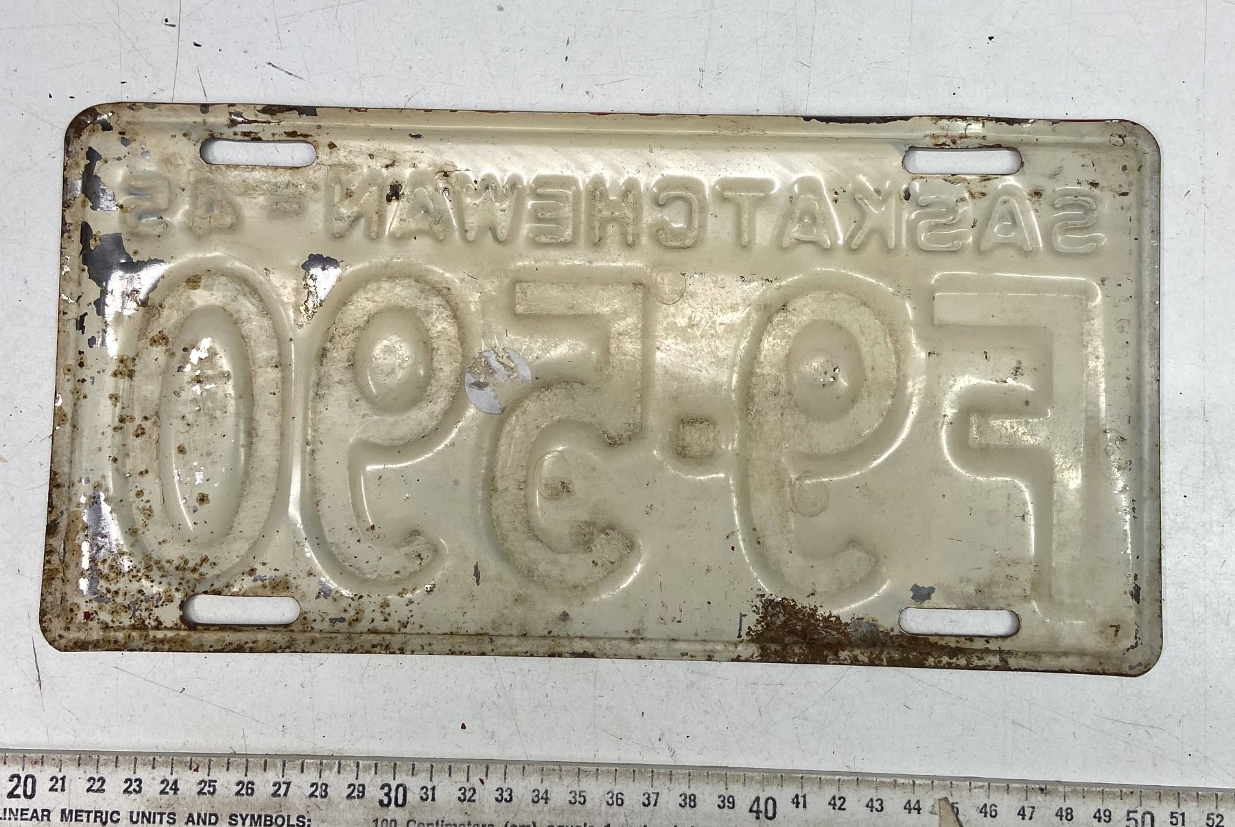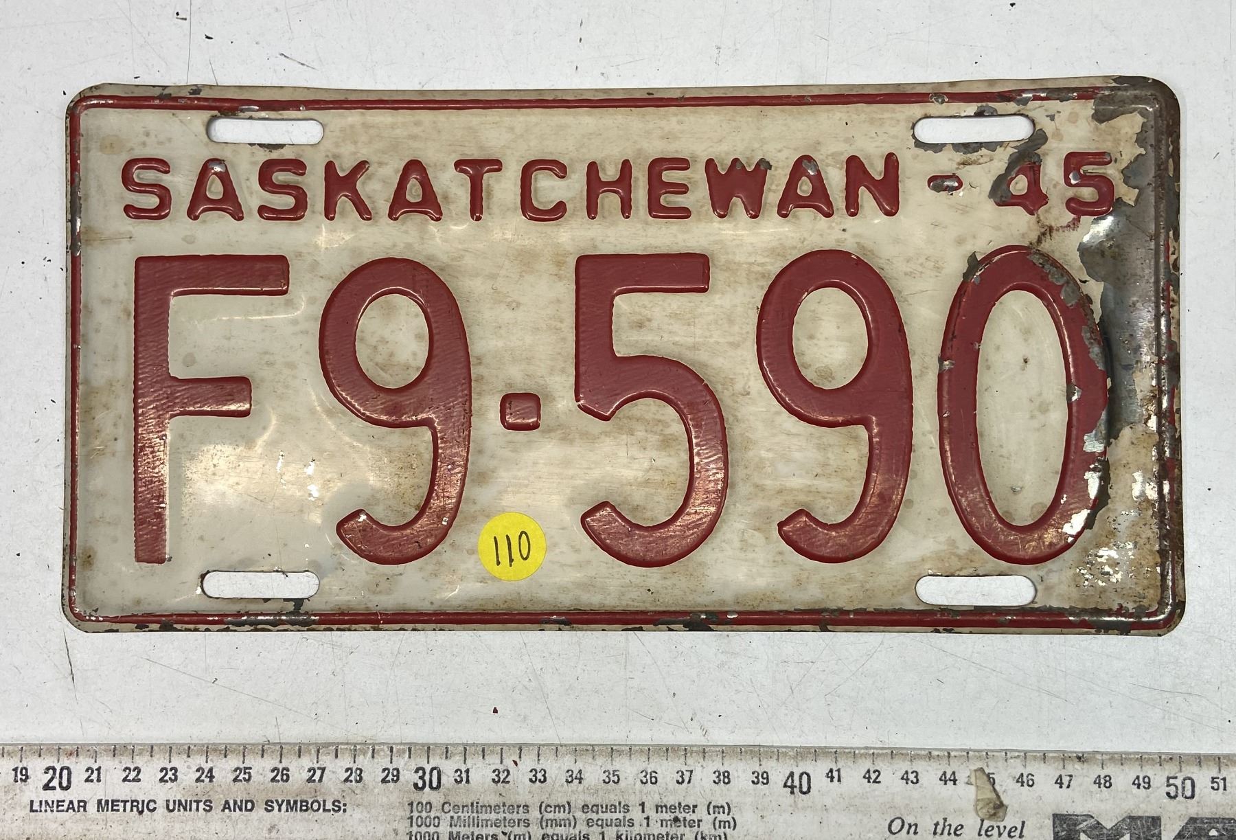 1945 Saskatchewan Canada Vintage License Plate F 9-590
