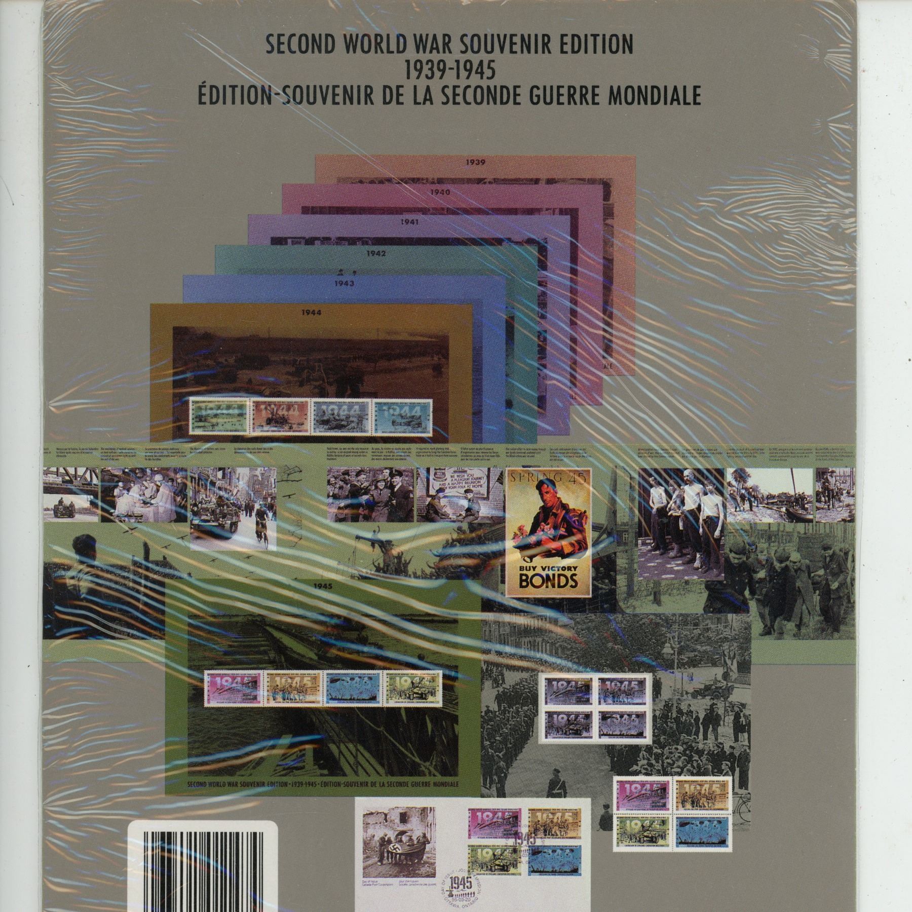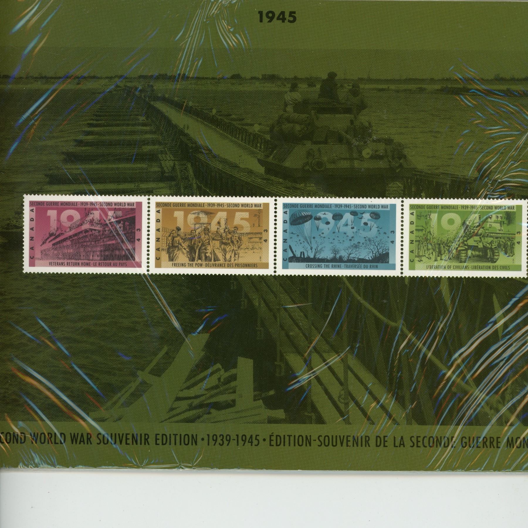 1945 Second World War Commemorative 43 Cent Stamps. Veterans Return, Freeing the POWs, Crossing the Rhine, & Liberation of Civilians. Housed in its unopened Canada Post packaging. Mint.