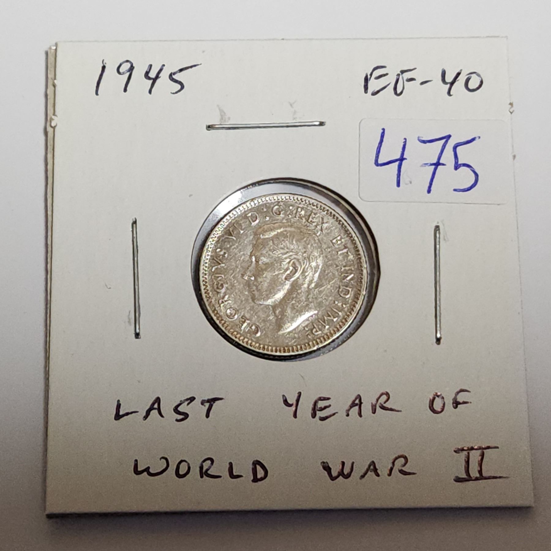 1945 Silver 10 Cents. Issued during the last year of World War II. EF-40.