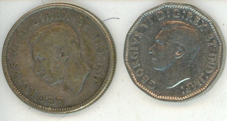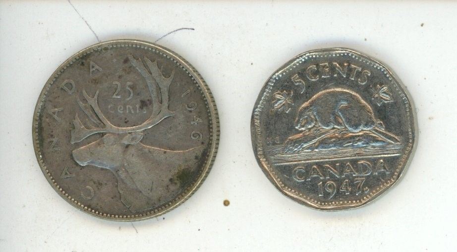 1946 Canada quarter, 1947 Canada Dime (Both coins are GeorgIVS VI D: G: REX ET IND: IMP)