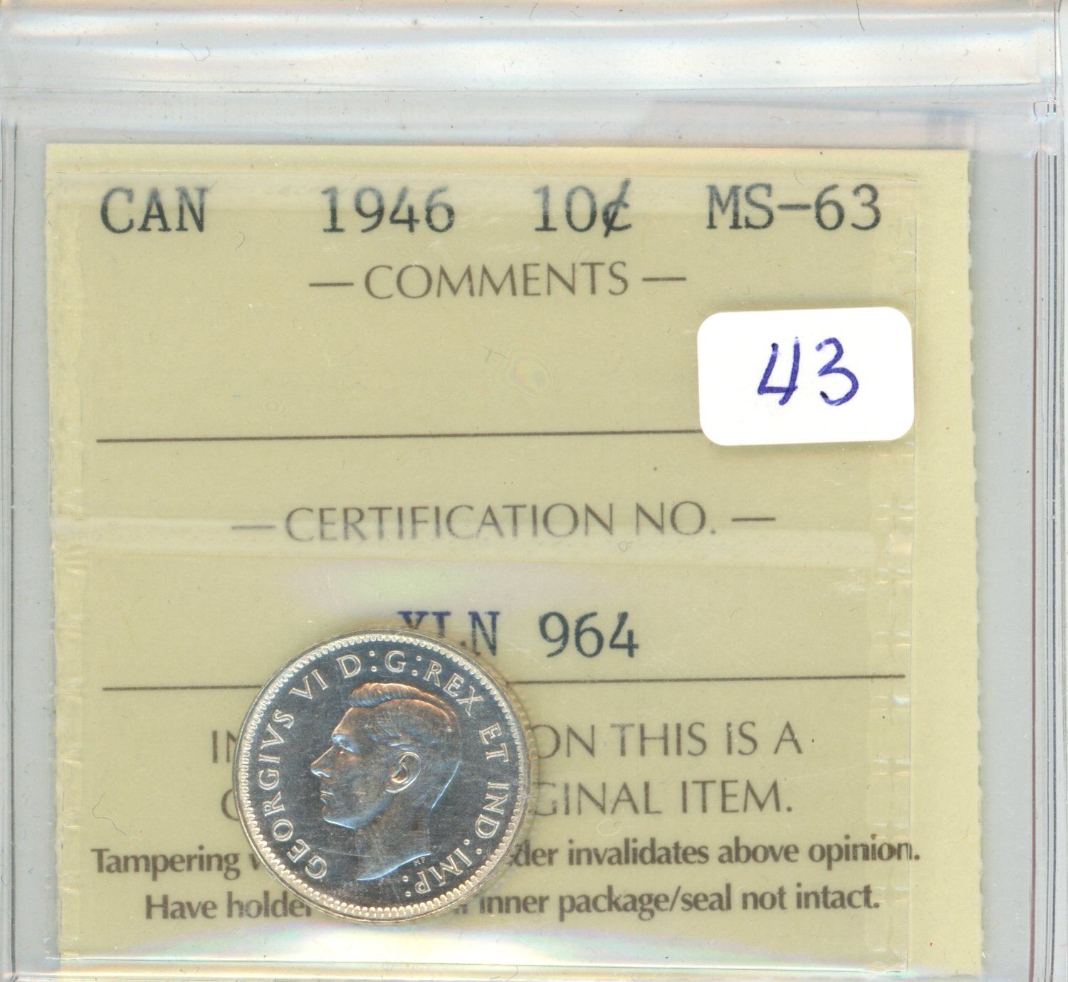 1946 Canadian Silver 10 Cents. ICCS certified & graded MS-63. Bright White.