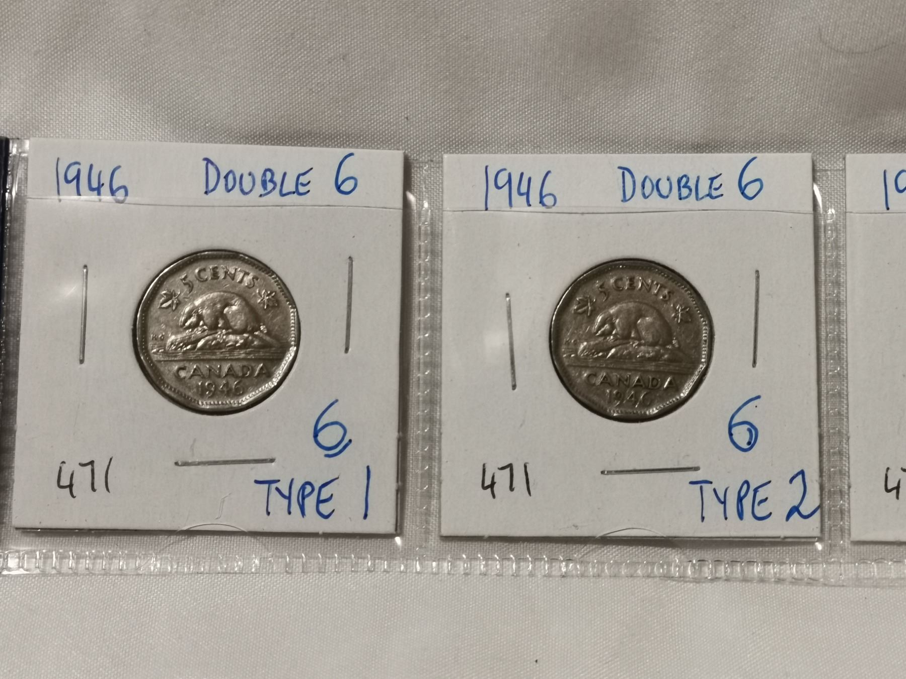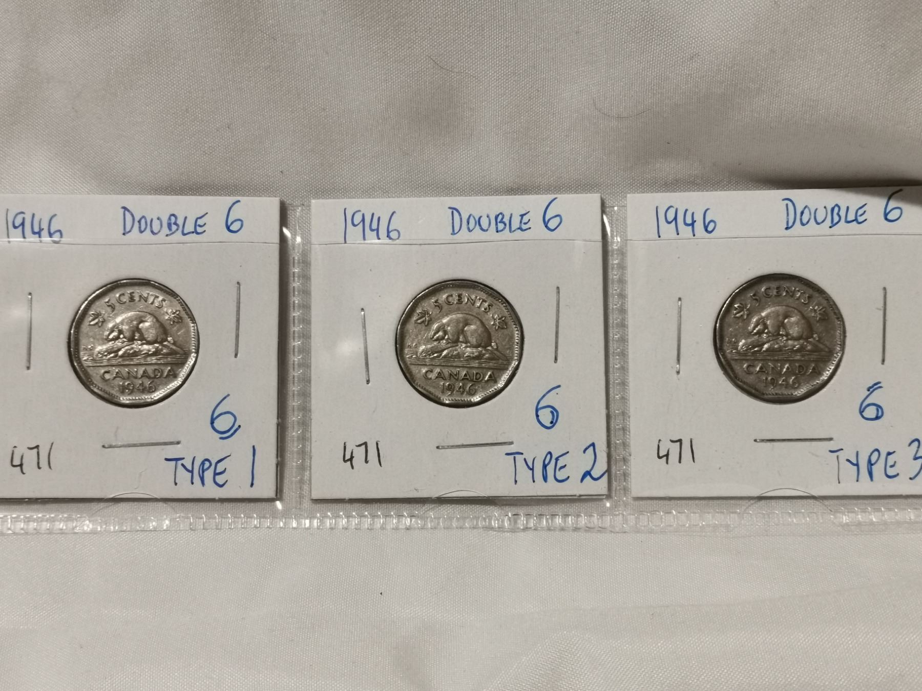 1946 Double 6 5¢ Coins, Type 1,2,3