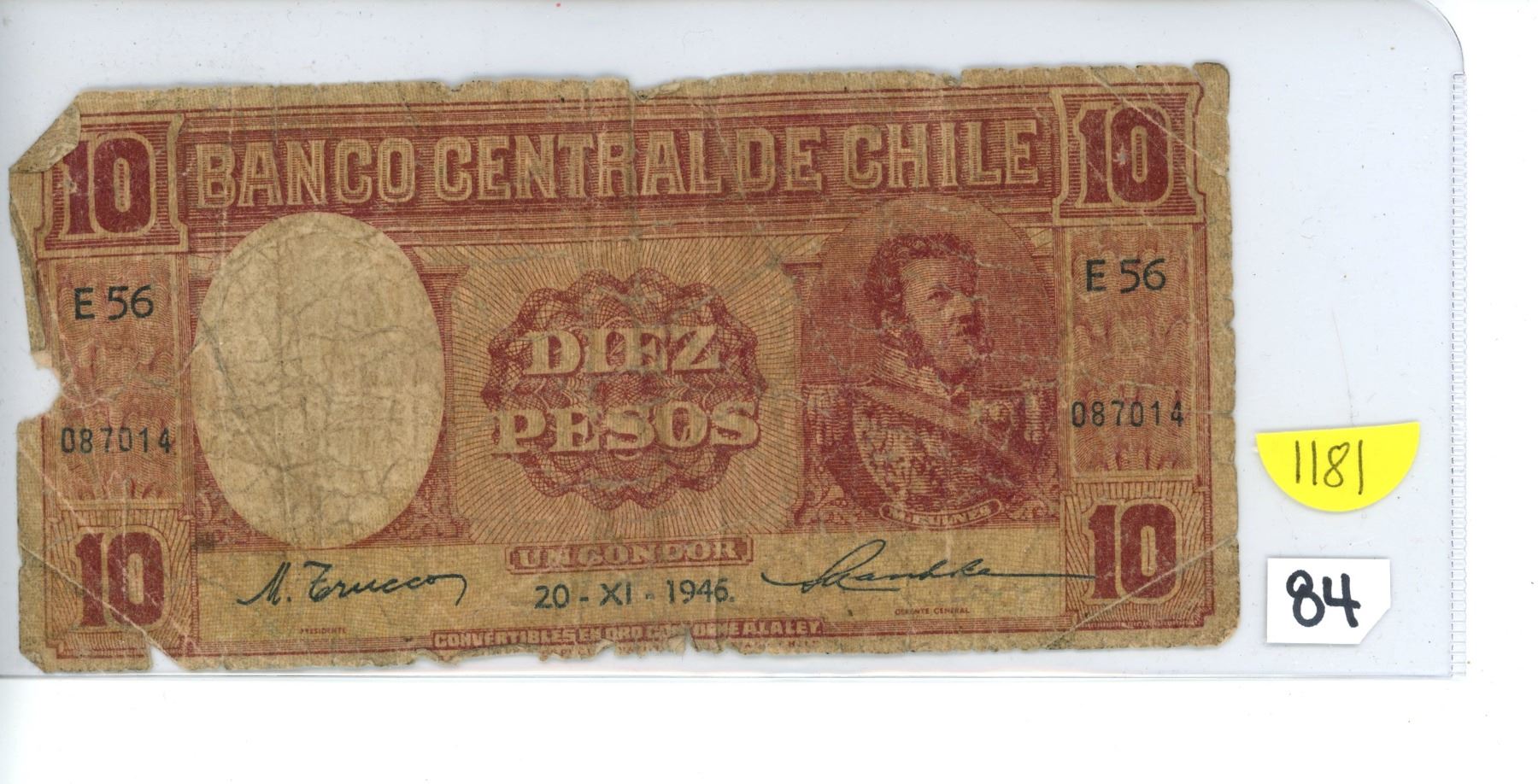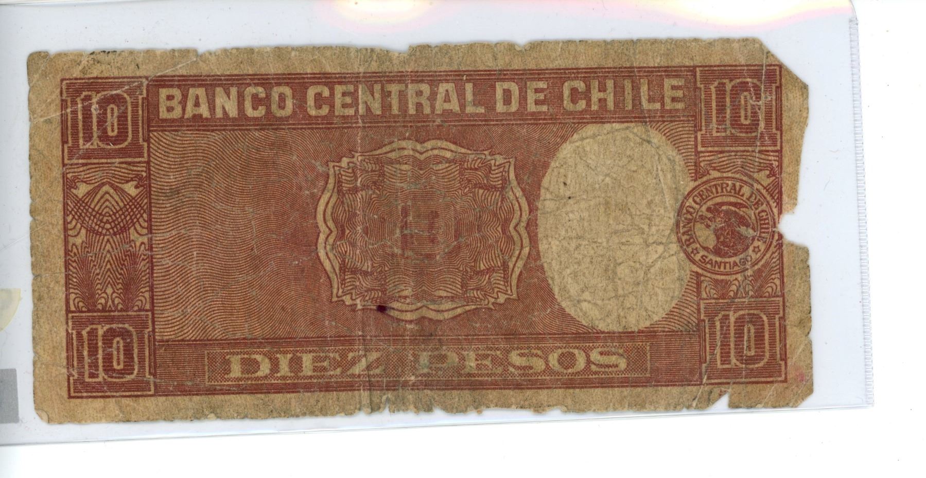 1946; Vintage WWII Blaco Central De Chili Diez Pesos 20-X1-1946