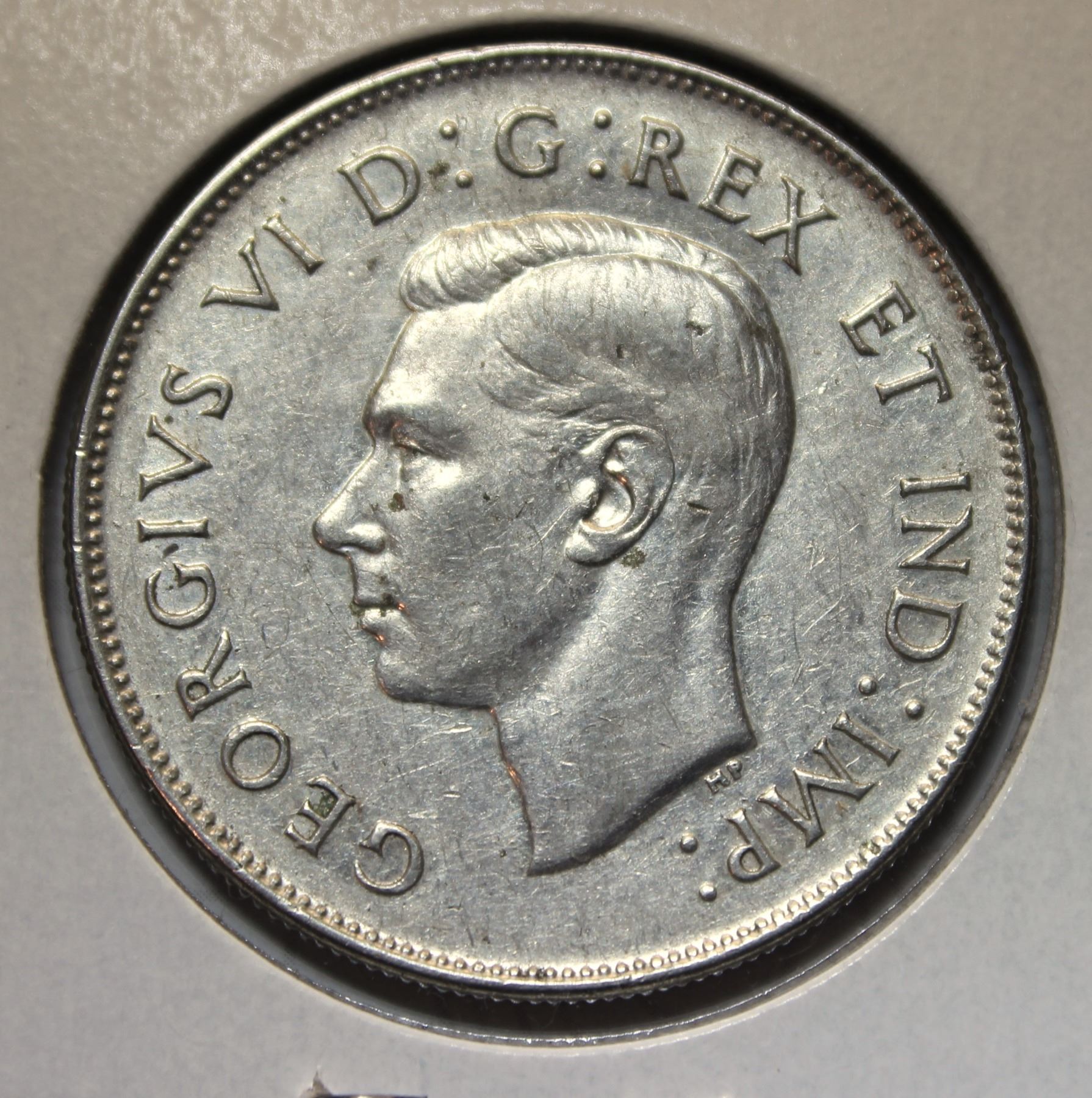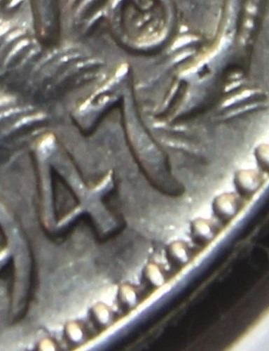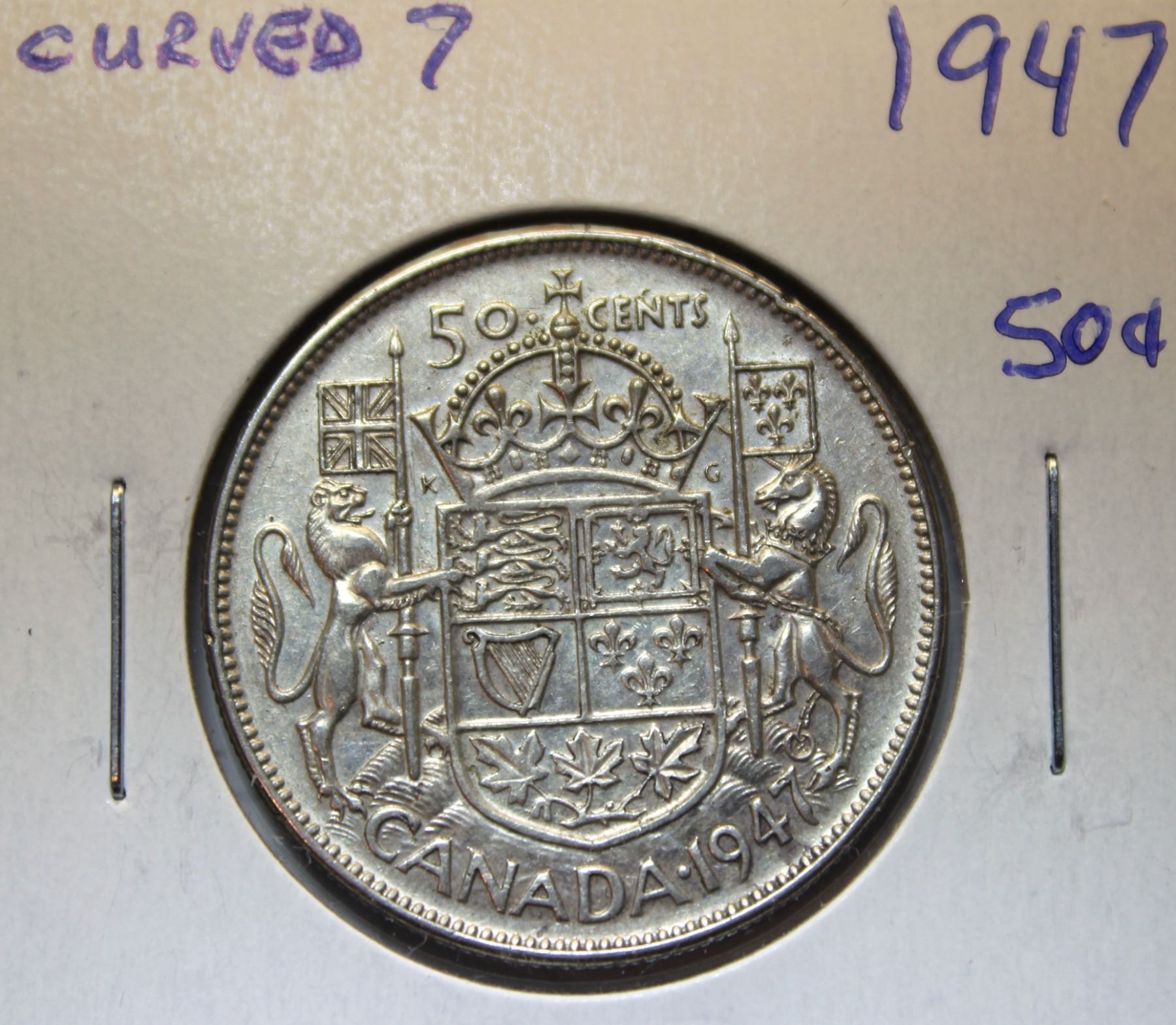 1947 Canada Silver 50 Cents Curved 7 - extention on corner of 4 and crater in top of 7