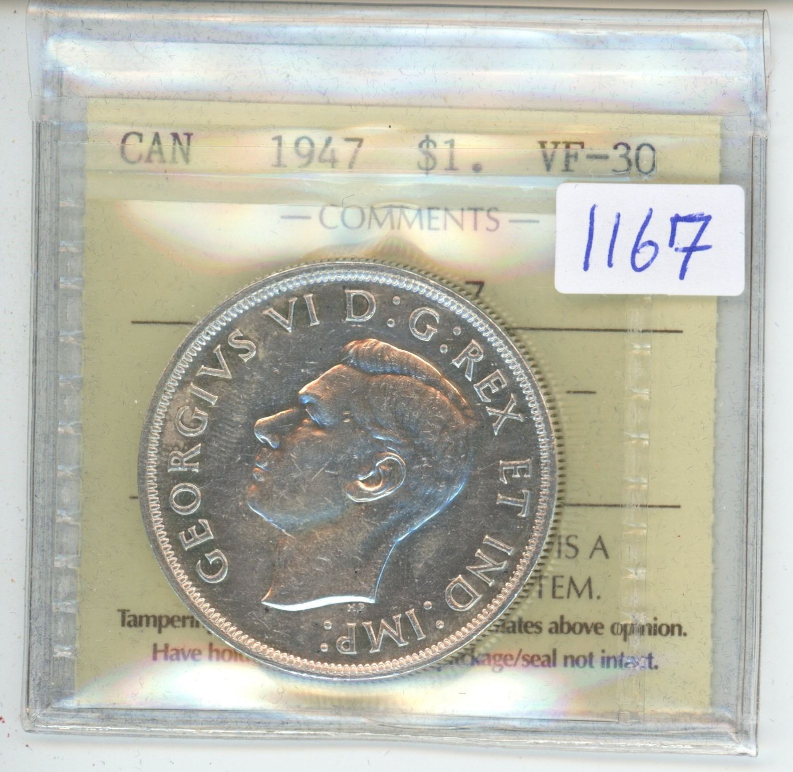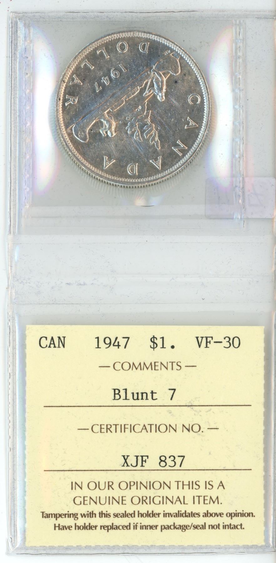 1947 ICCS Graded, Canadian voyageur silver dollar - VF30