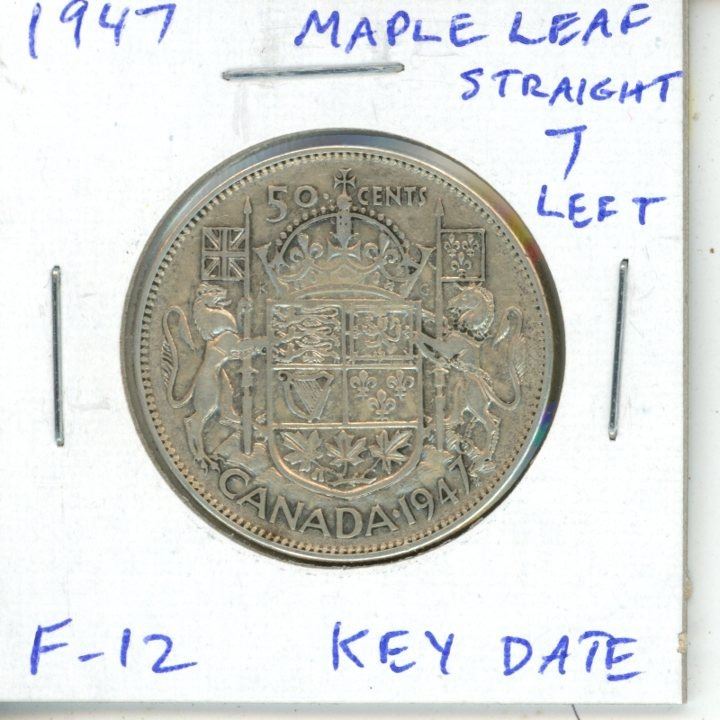 1947 Maple Leaf Straight 7 Left Silver 50 Cents. Key Date. Mintage of 38,433 for both varieties. F-12. Scarce.