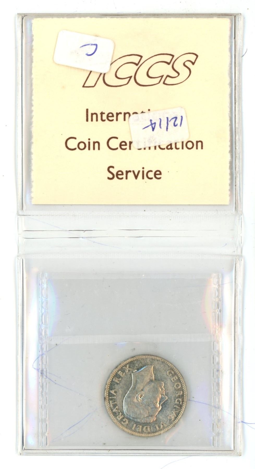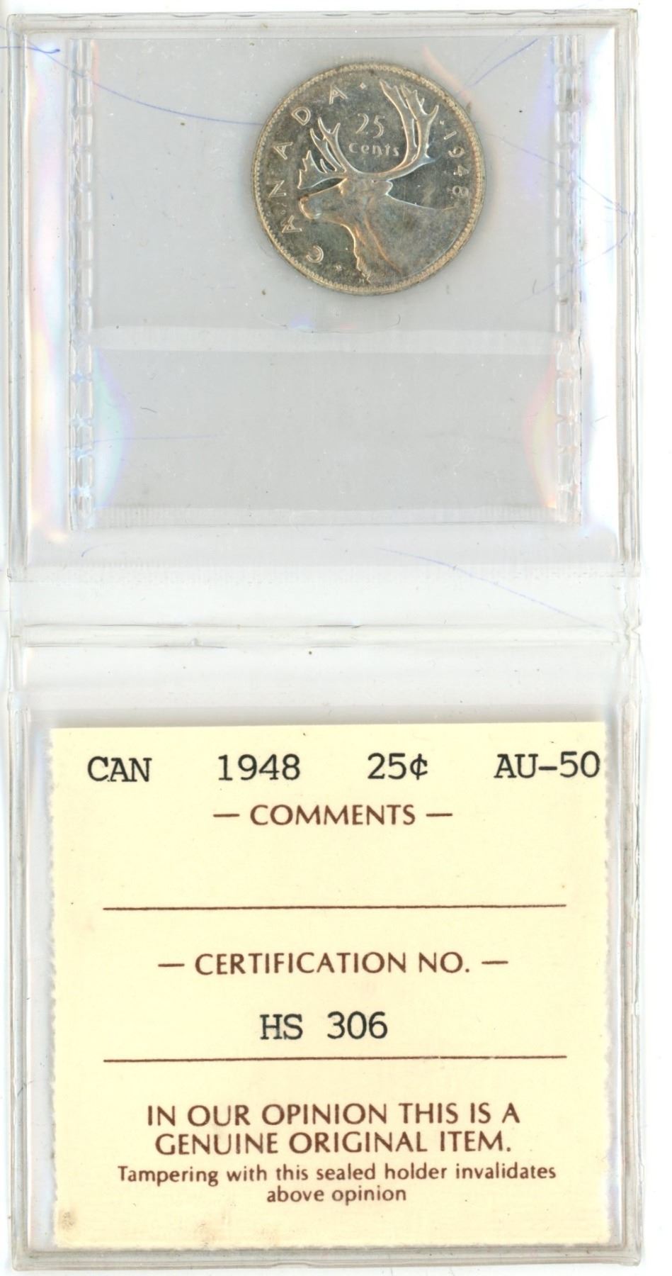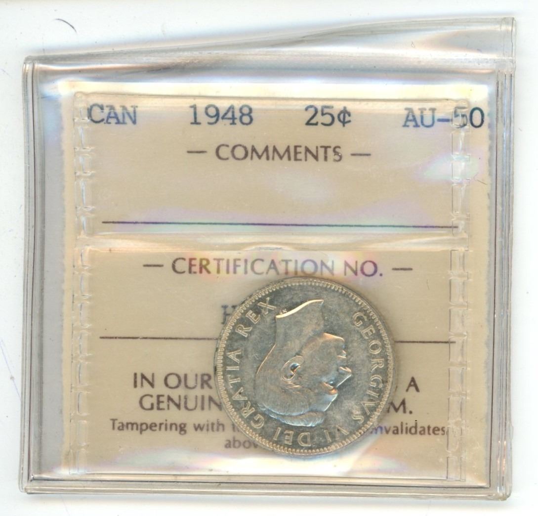 1948 ICCS Graded, Canadian silver 25 cent coin - AU-50