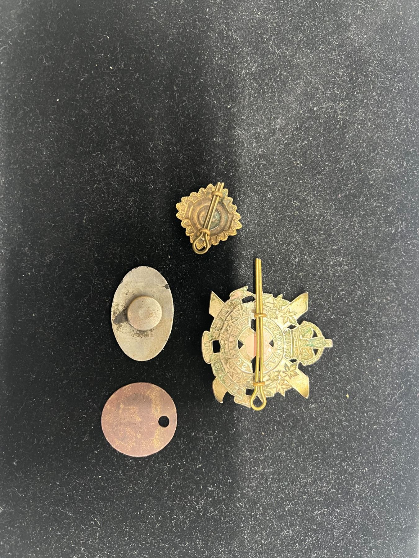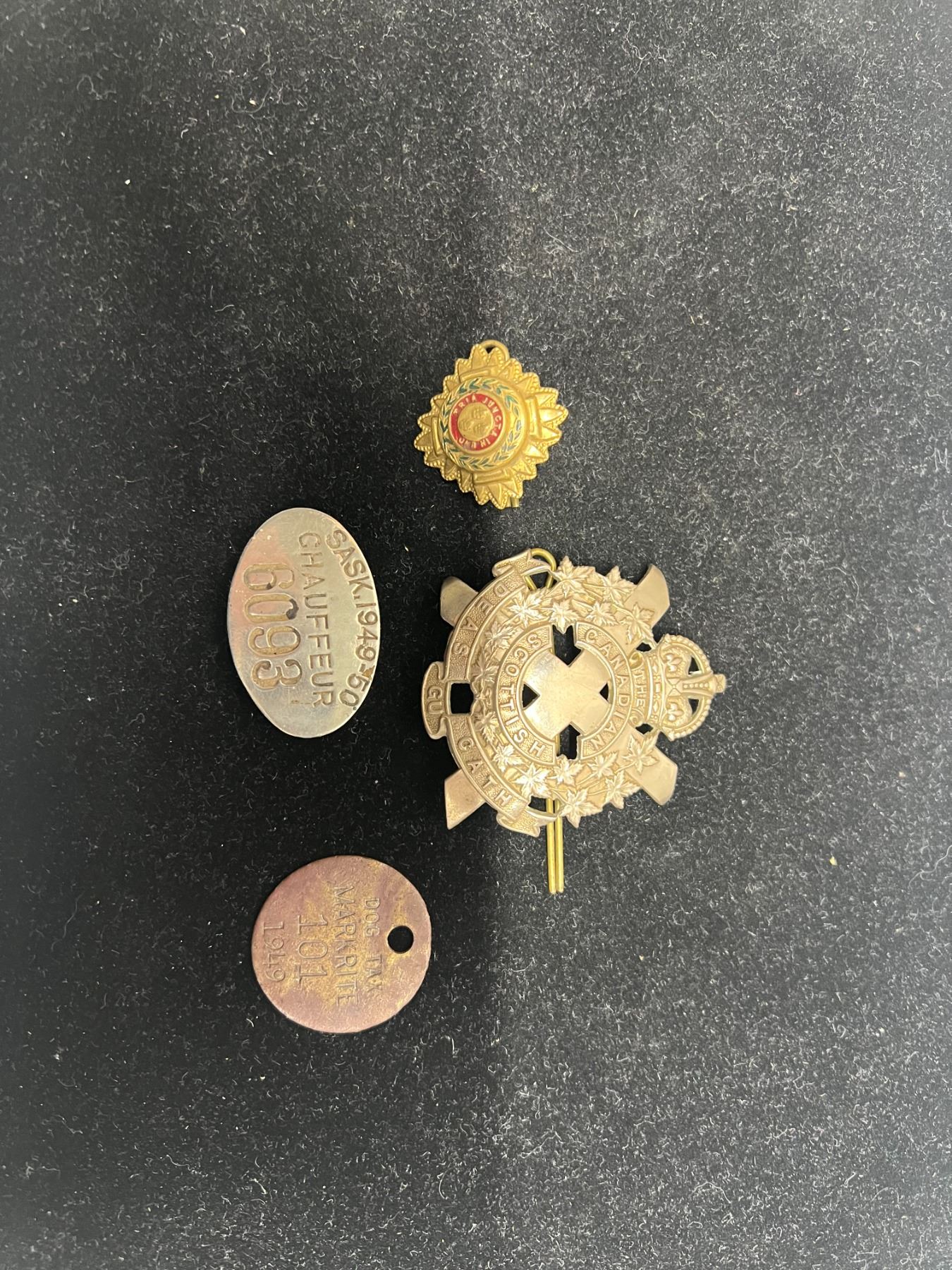 1949-50 Badge Chauffeur, 1949 Dog Tax Tag Markrite, The Canadian Scottish Badge, Tria Junta In Uno Badge