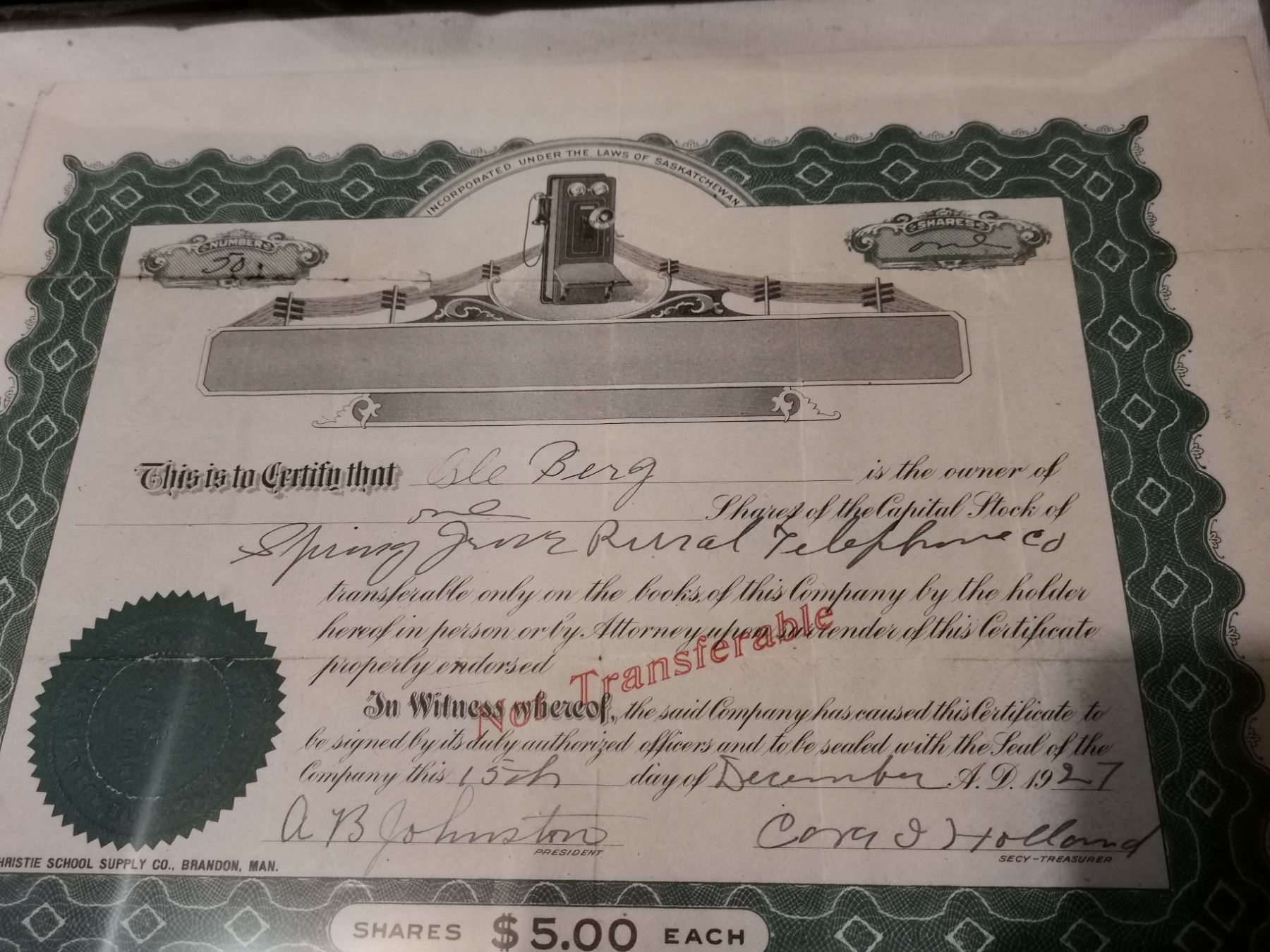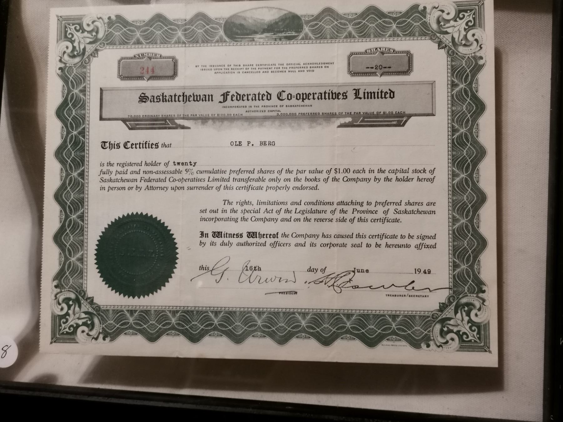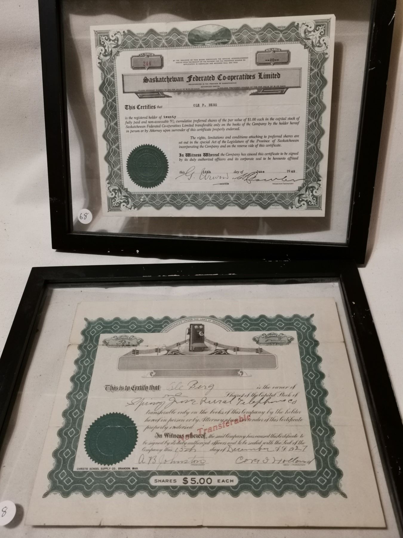 1949 CO-OP AND 1927 SPRING JUNE SHARES, FRAMED
