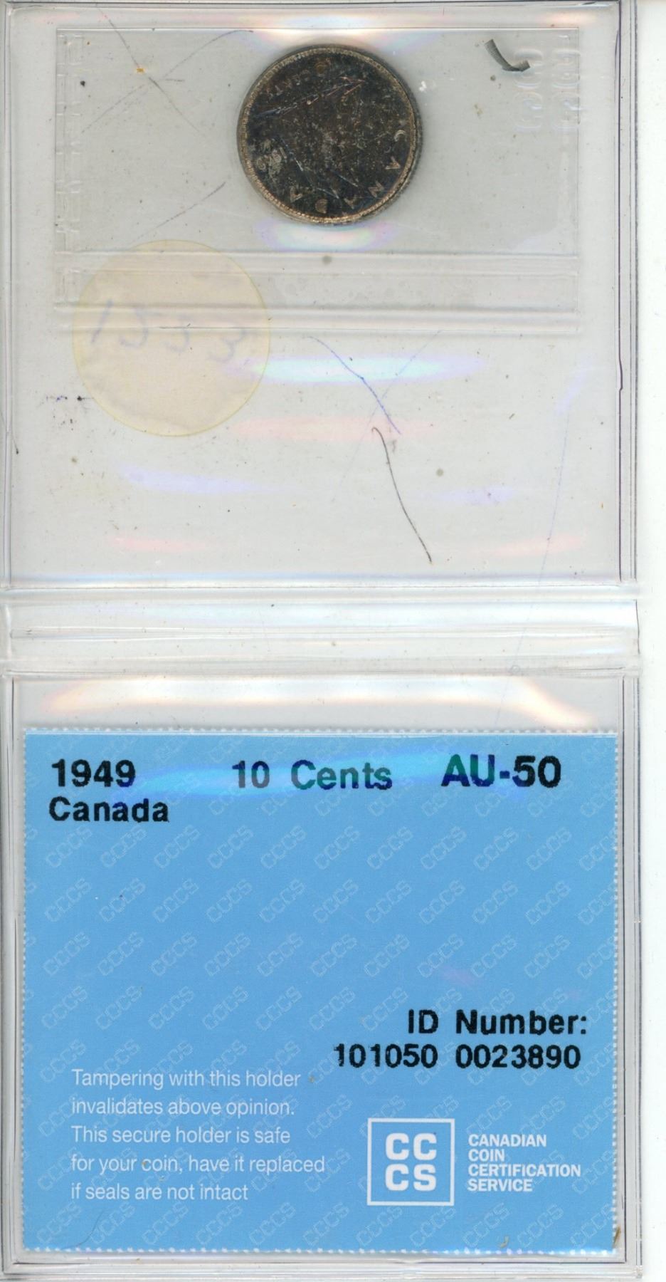 1949 Canadian Silver 10 Cents. CCCS certified and graded AU-50.