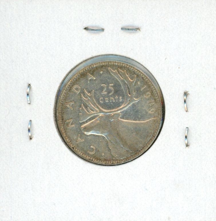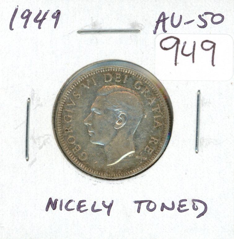 1949 Canadian Silver 25 Cents. AU-50. Nicely Toned.
