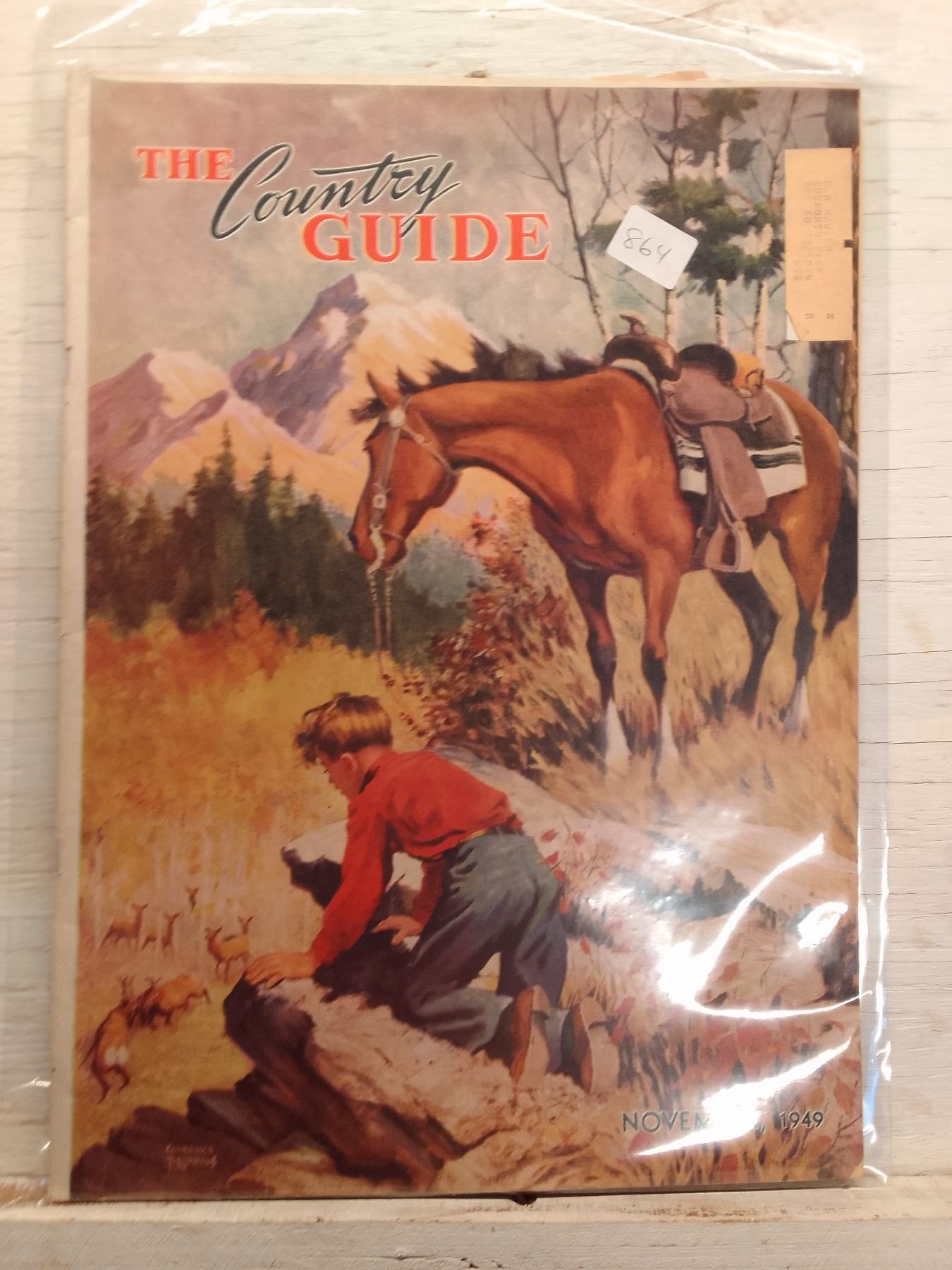 1949 Country Guide Cover: Boy Petting Puppy Beside Saddled Horse- The Country Guide is Canada's longstanding farm magazine, originating in 1908 and serving prairie farmers with practical advice, rural news, and wholesome family content. This November 1949 issue features a nostalgic painted cover of a young boy kneeling to pet a puppy in tall grass, with a saddled horse waiting patiently against a mountainous backdrop. It endures today as Country Guide.
