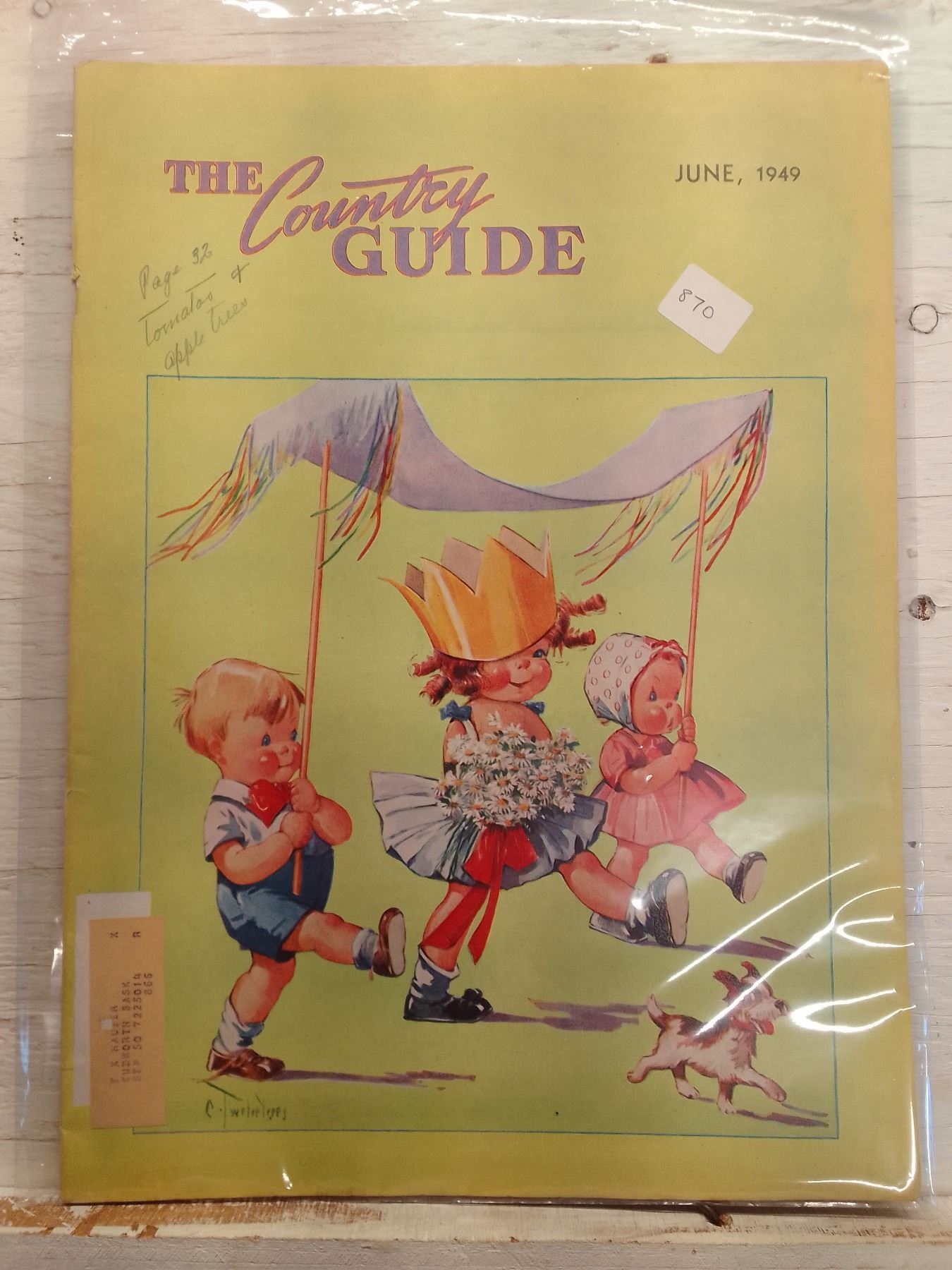 1949 Country Guide Cover: Children in Festive Parade with Flags and Puppy- The Country Guide is Canada's enduring farm magazine, rooted in 1908, delivering practical agriculture, rural news, and family content to prairie readers. This June 1949 issue features a charming illustrated cover by A. Twelvetrees of three young children in a joyful parade—one crowned, carrying flags and flowers—with a playful puppy trotting alongside. It continues today as Country Guide.