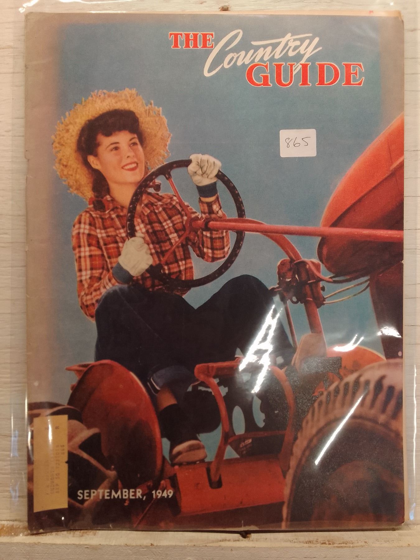 1949 Country Guide Cover: Smiling Woman Driving Red Tractor- The Country Guide is Canada's enduring farm magazine, founded in 1908 and serving rural families with agricultural advice, news, and lifestyle features. This September 1949 issue features a vibrant photographic cover of a cheerful young woman in a straw hat and plaid shirt confidently driving a red tractor under a clear blue sky, embodying postwar rural optimism. It continues today as Country Guide.