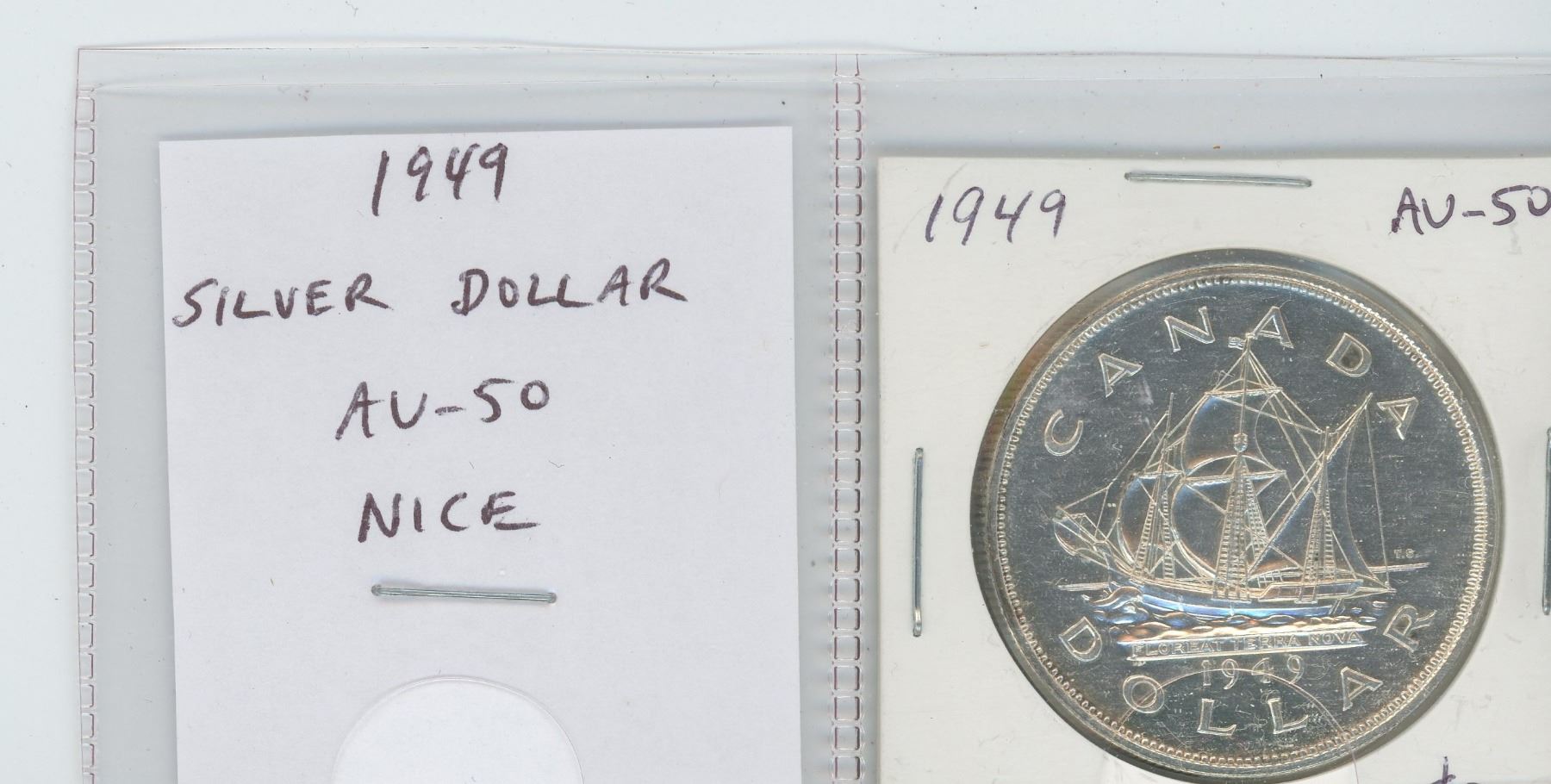 1949 SILVER DOLLAR. AU-50. NICE. COMMEMORATES NEWFOUNDLAND JOINING CANADA AND DEPICTS JOHN CABOT’S SHIP MATTHEW.