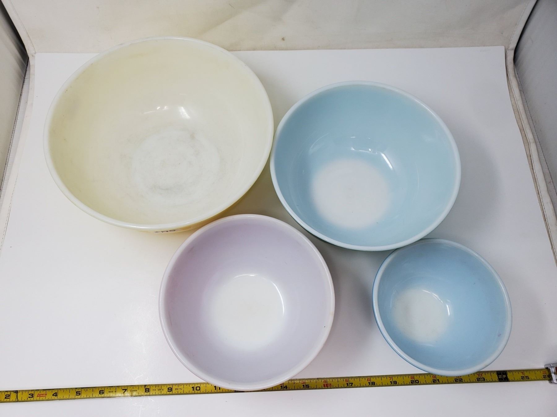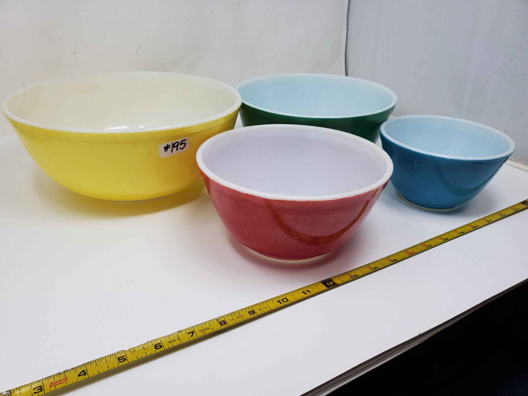 195. Pyrex, primary set, yellow, green, red and blue bowls