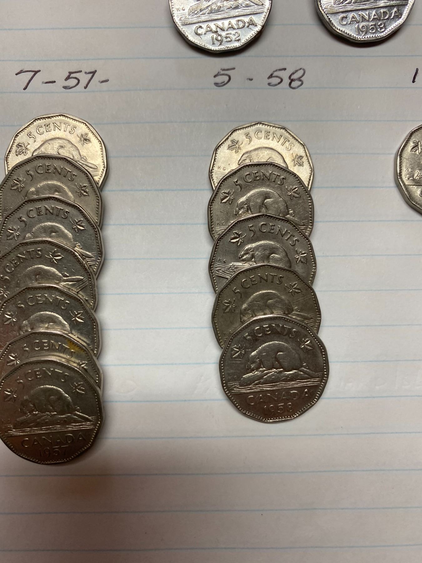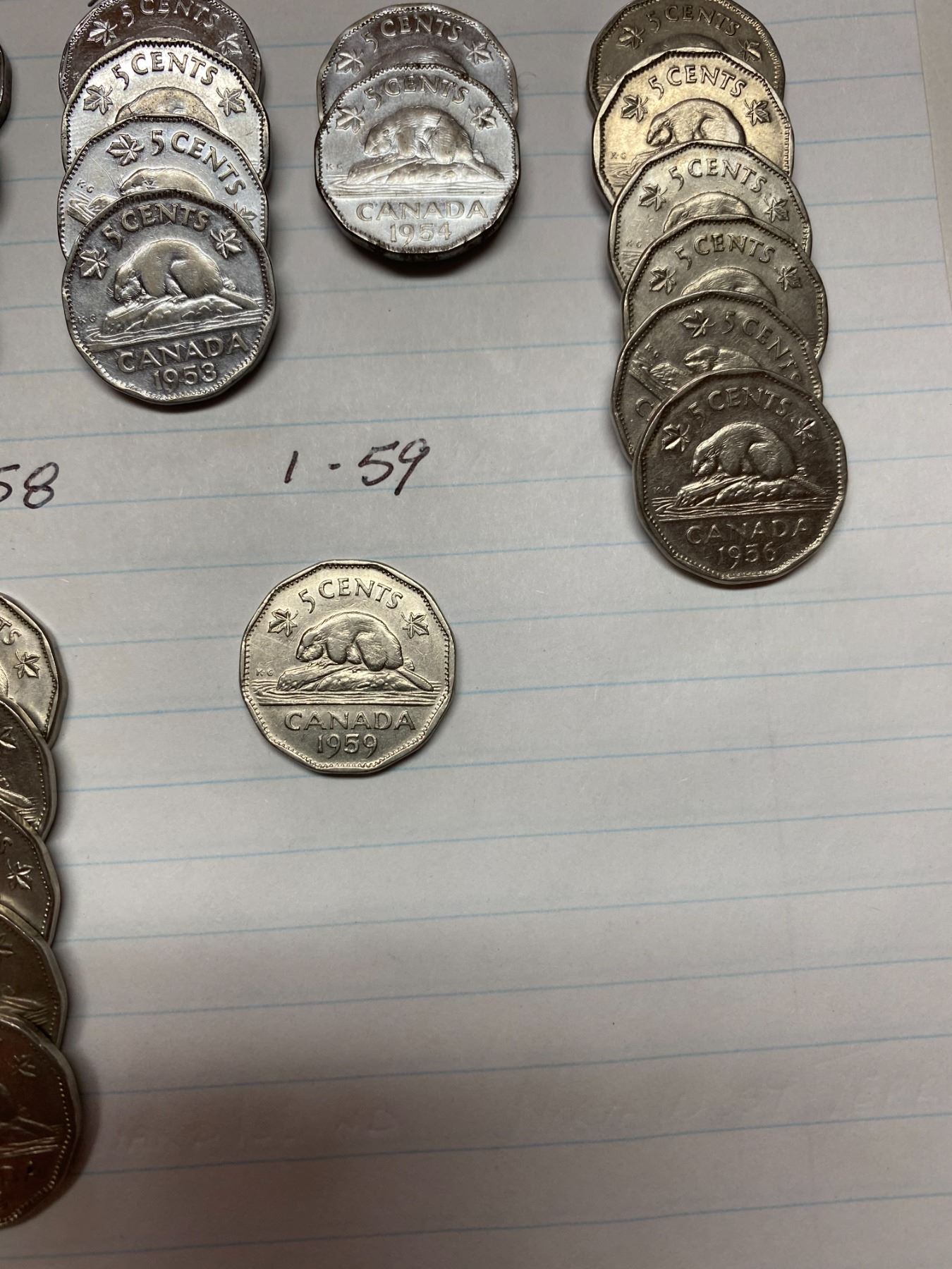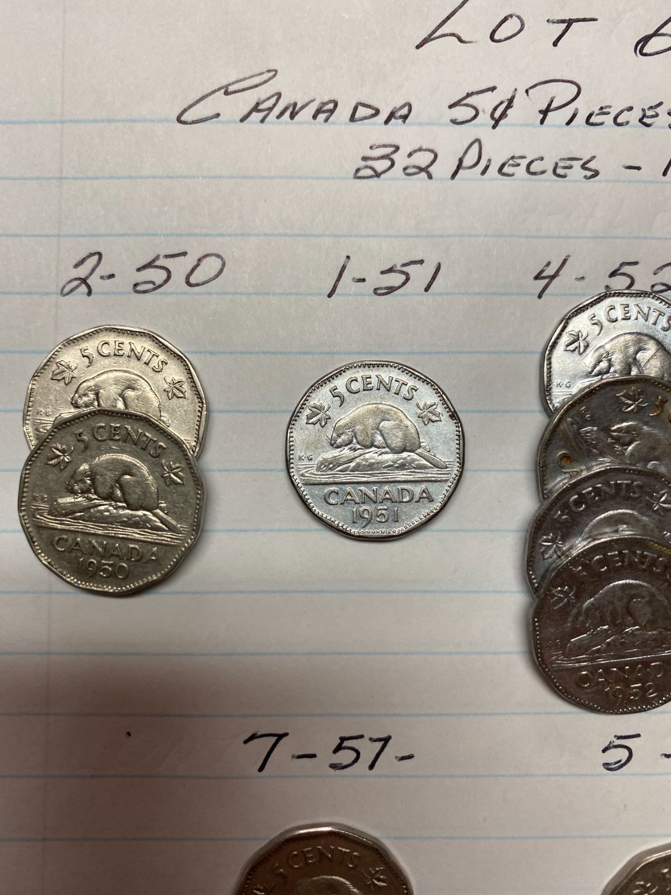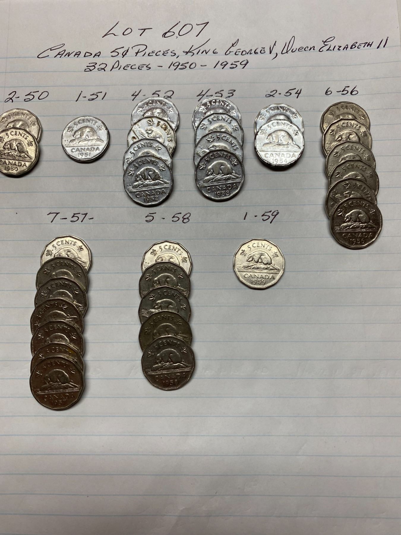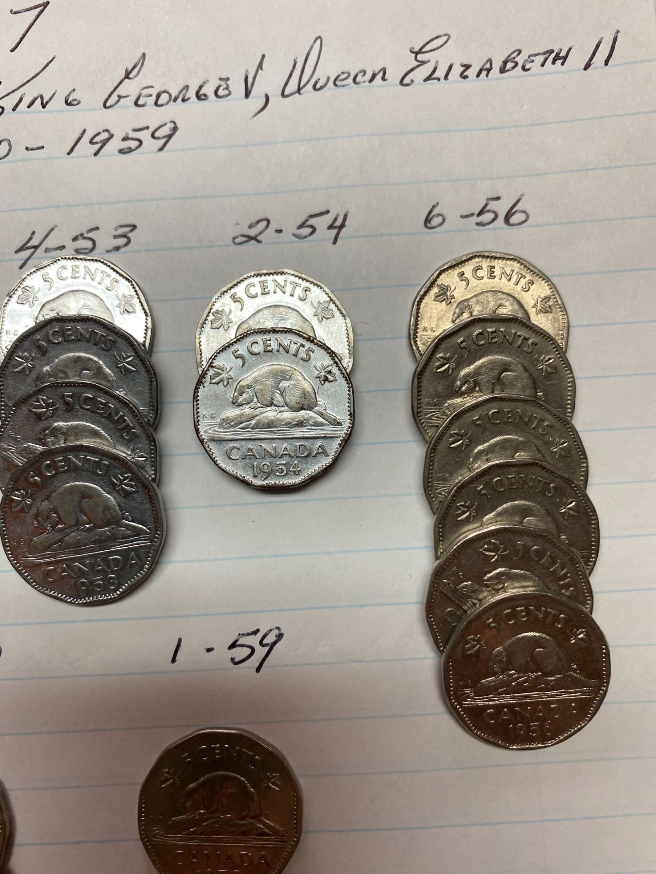 1950-1959, 32 Canada 5 cent pieces, King George VI & Queen Elizabeth II