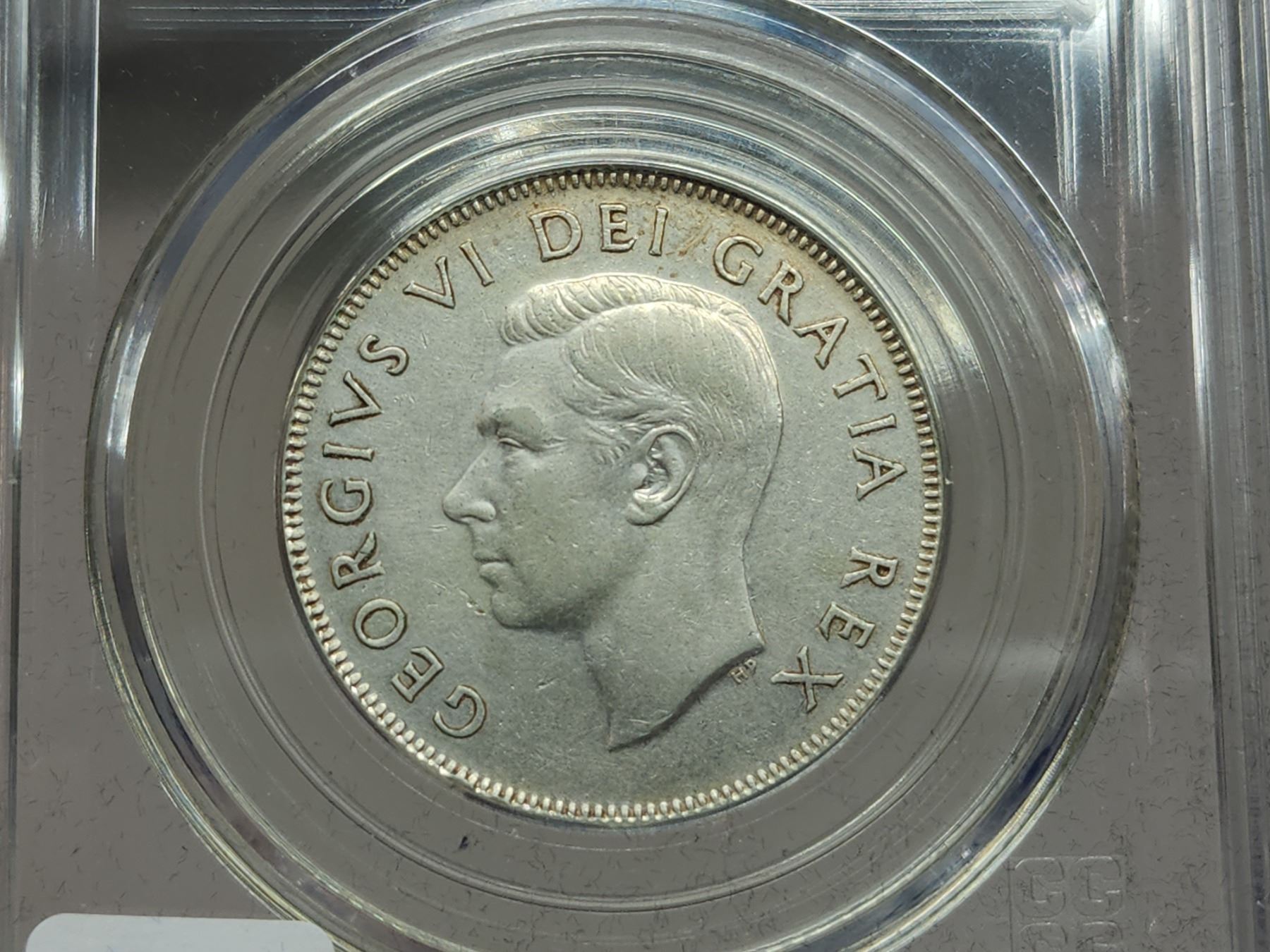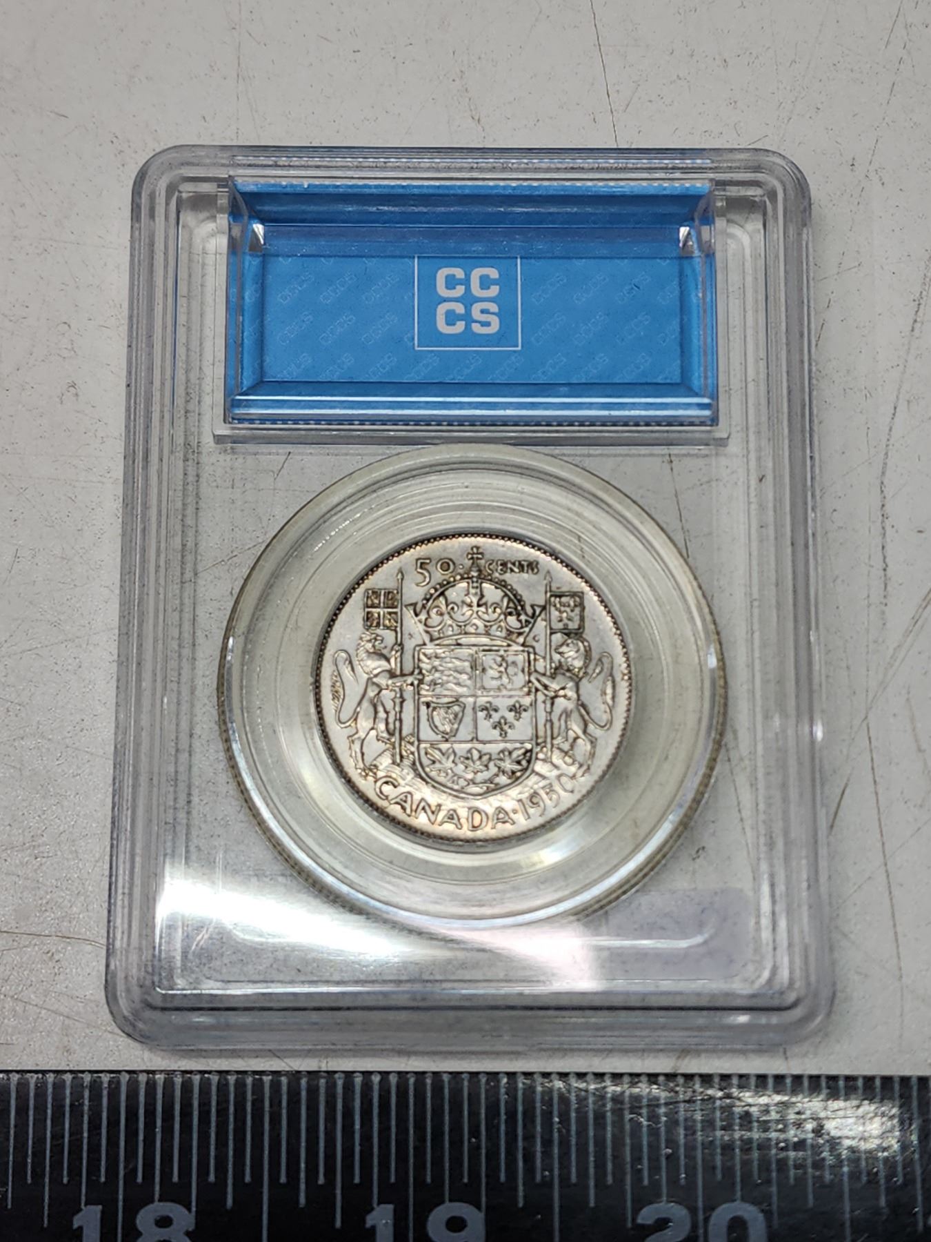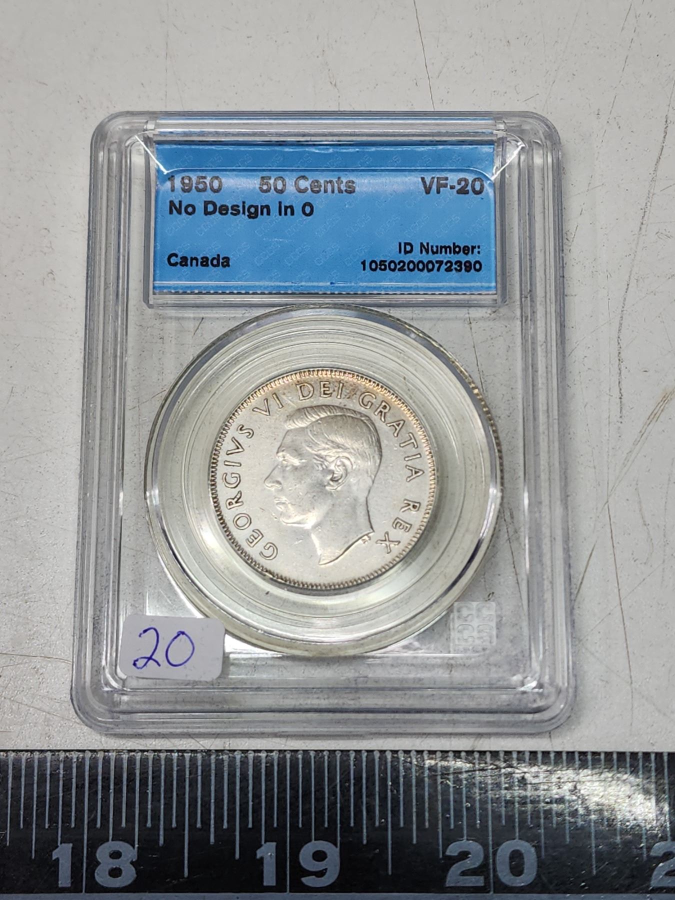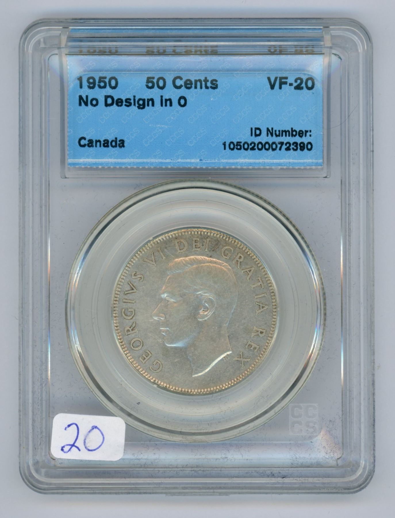 1950 CCCS graded. Canadian silver, "No design in 0" 50 cent coin - VF 20