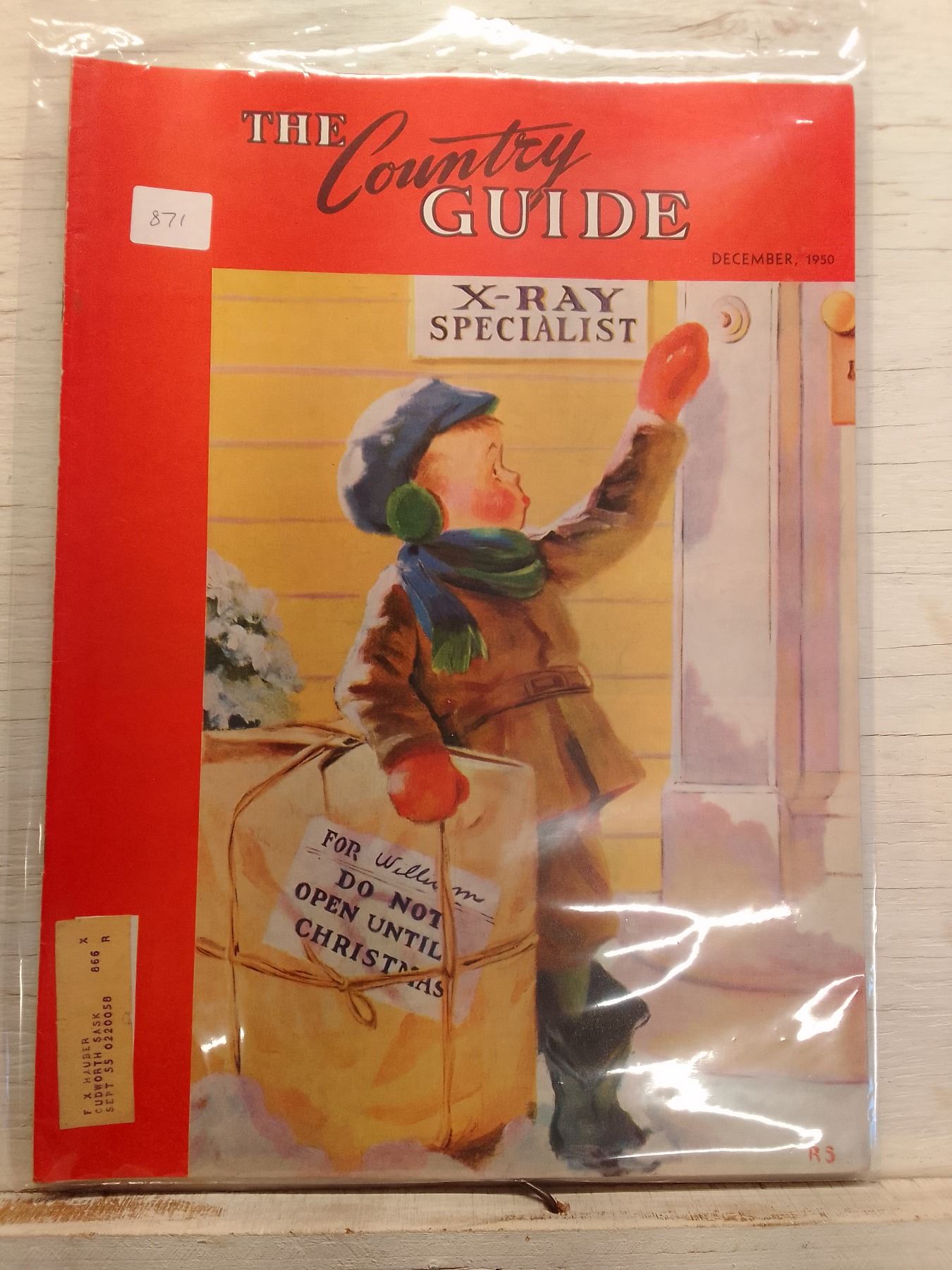 1950 Country Guide Cover: Boy Delivering "Do Not Open Until Christmas" Gift - *The Country Guide* is Canada's historic farm magazine, founded in 1908 to support rural prairie families with agriculture, news, and lifestyle content. This festive December 1950 issue features a humorous illustrated cover of a boy in winter attire delivering a large wrapped gift labeled "Do Not Open Until Christmas" to an "X-Ray Specialist." It continues today as *Country Guide*.