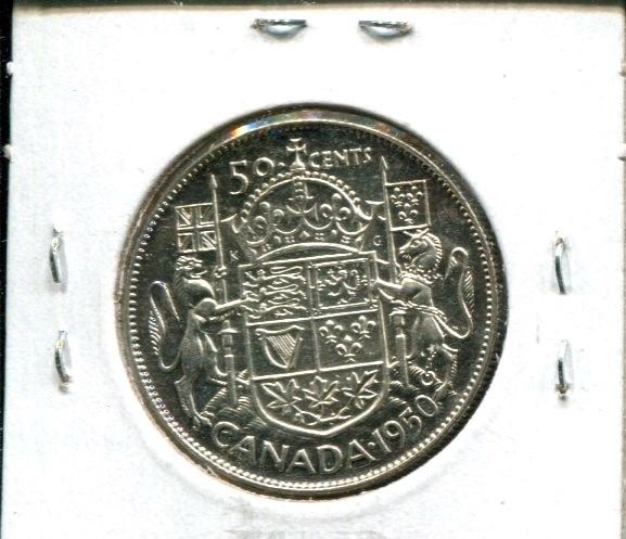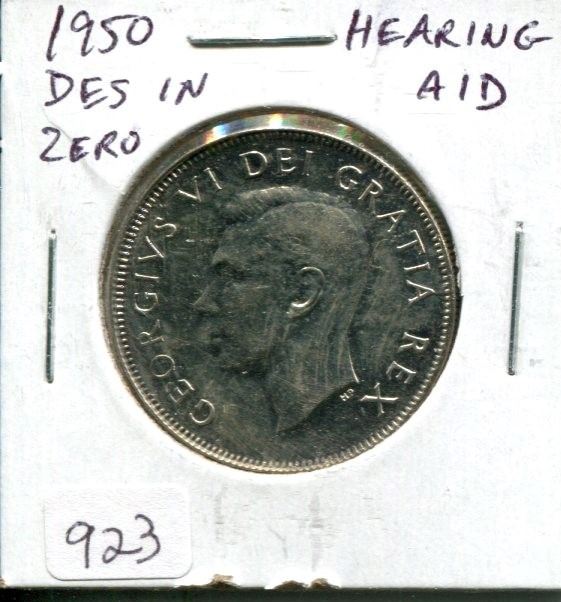 1950 Design in Zero Hearing Aid in Ear Canadian Silver 50 Cents. Die Clash. Scarce. EF-40. Nice.