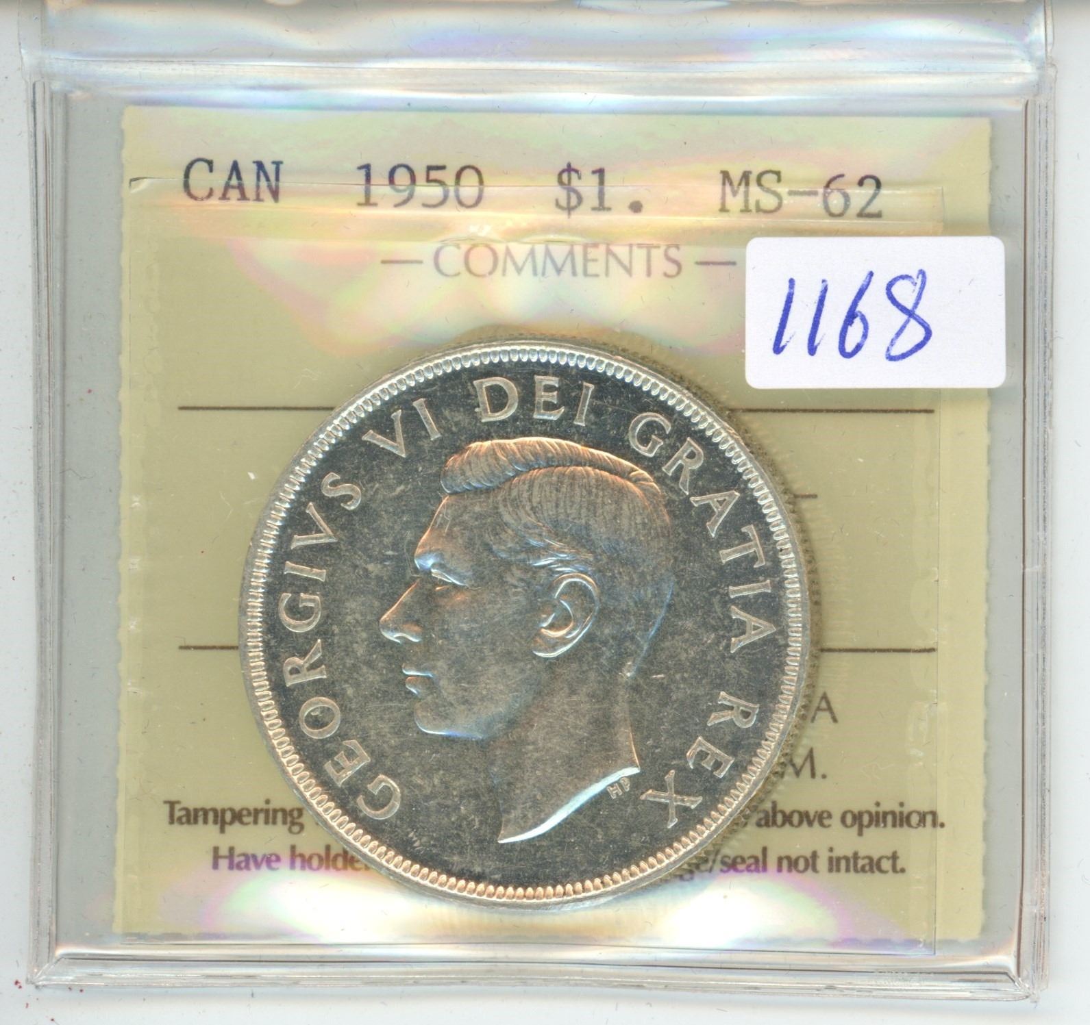 1950 ICCS Graded, Canadian voyageur silver dollar MS-62