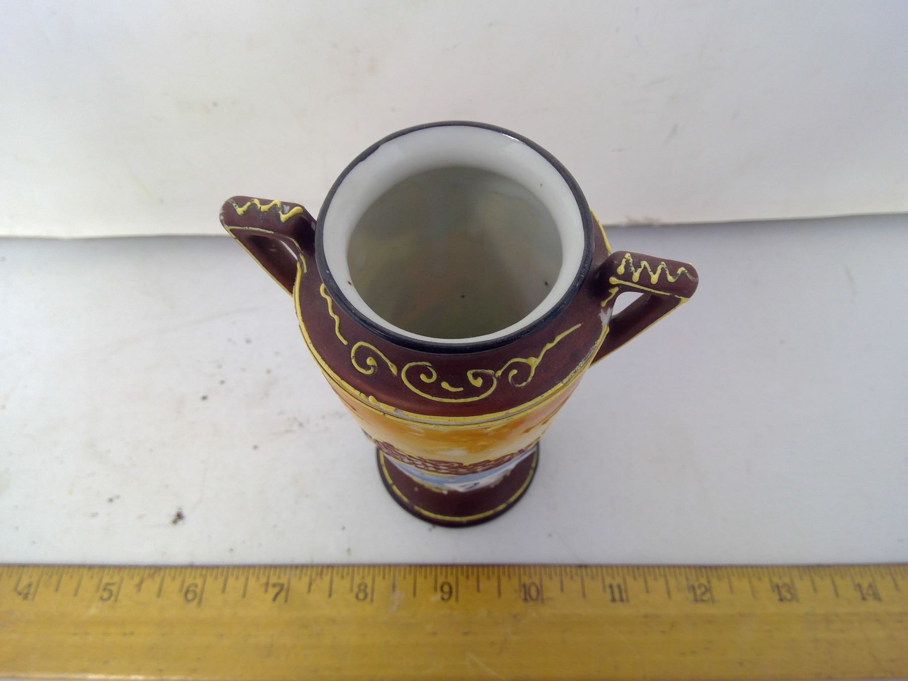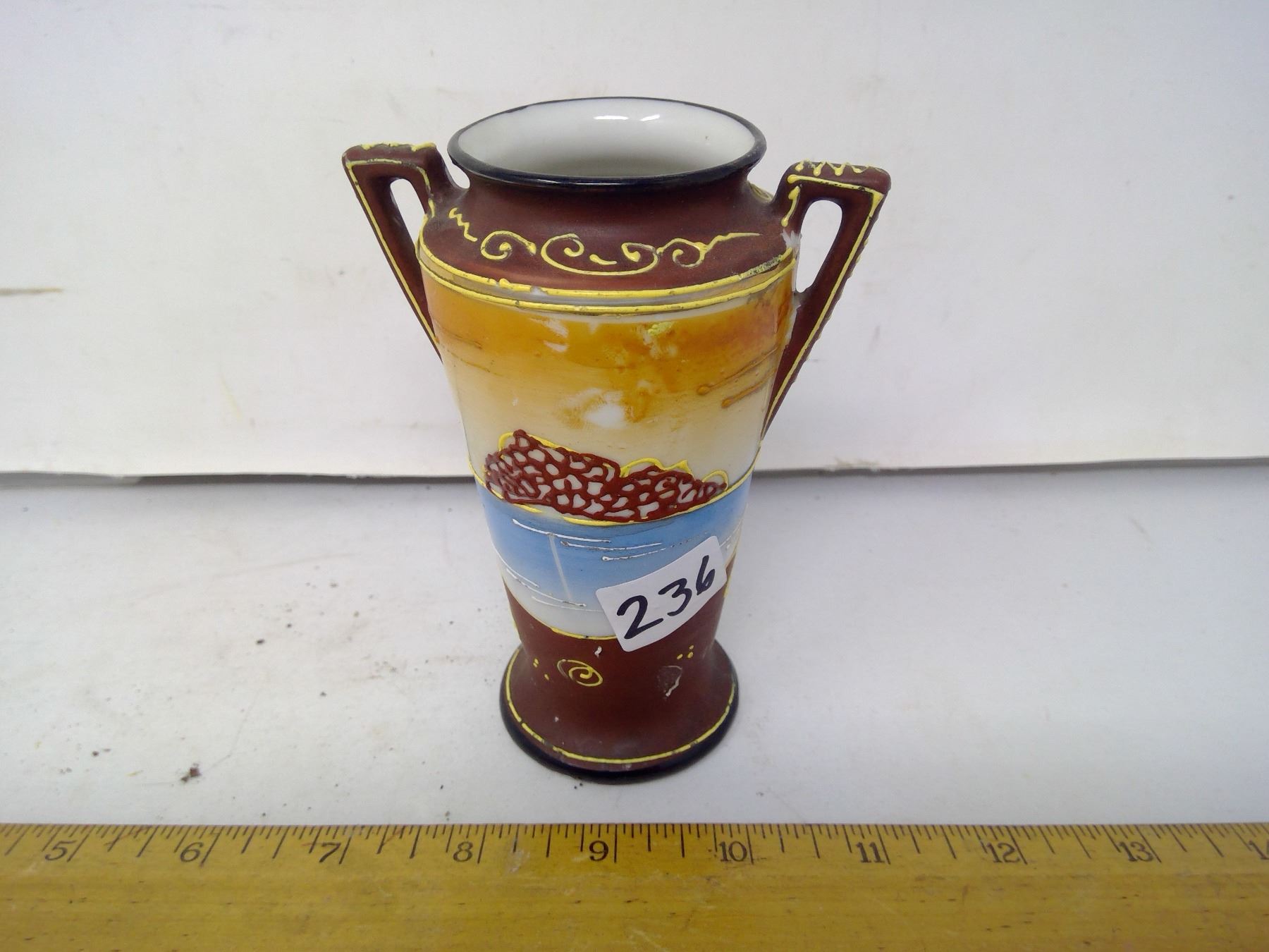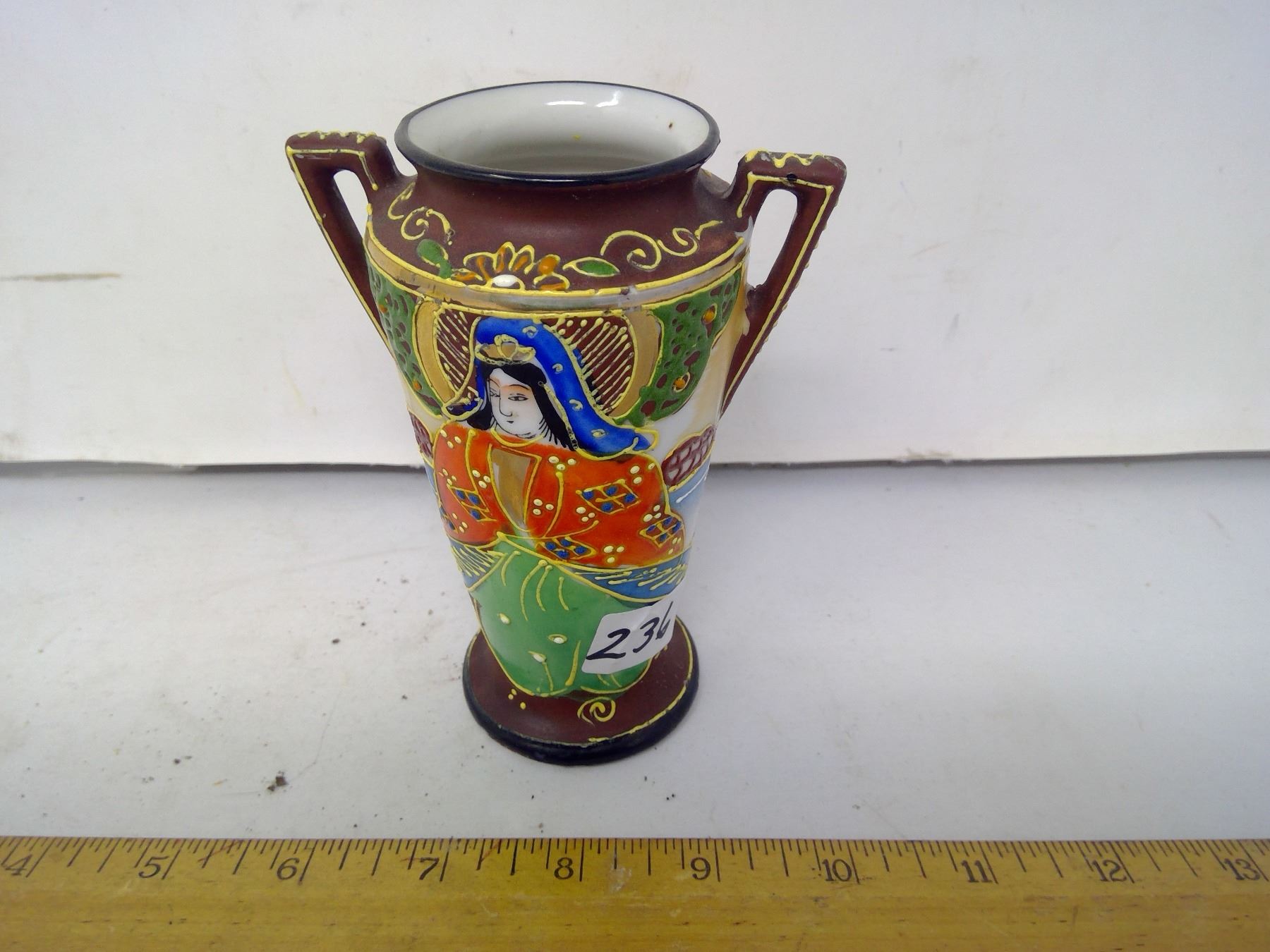236 1950 Japan porcelain vase painted with a goddess wearing halo. Height: 5”.