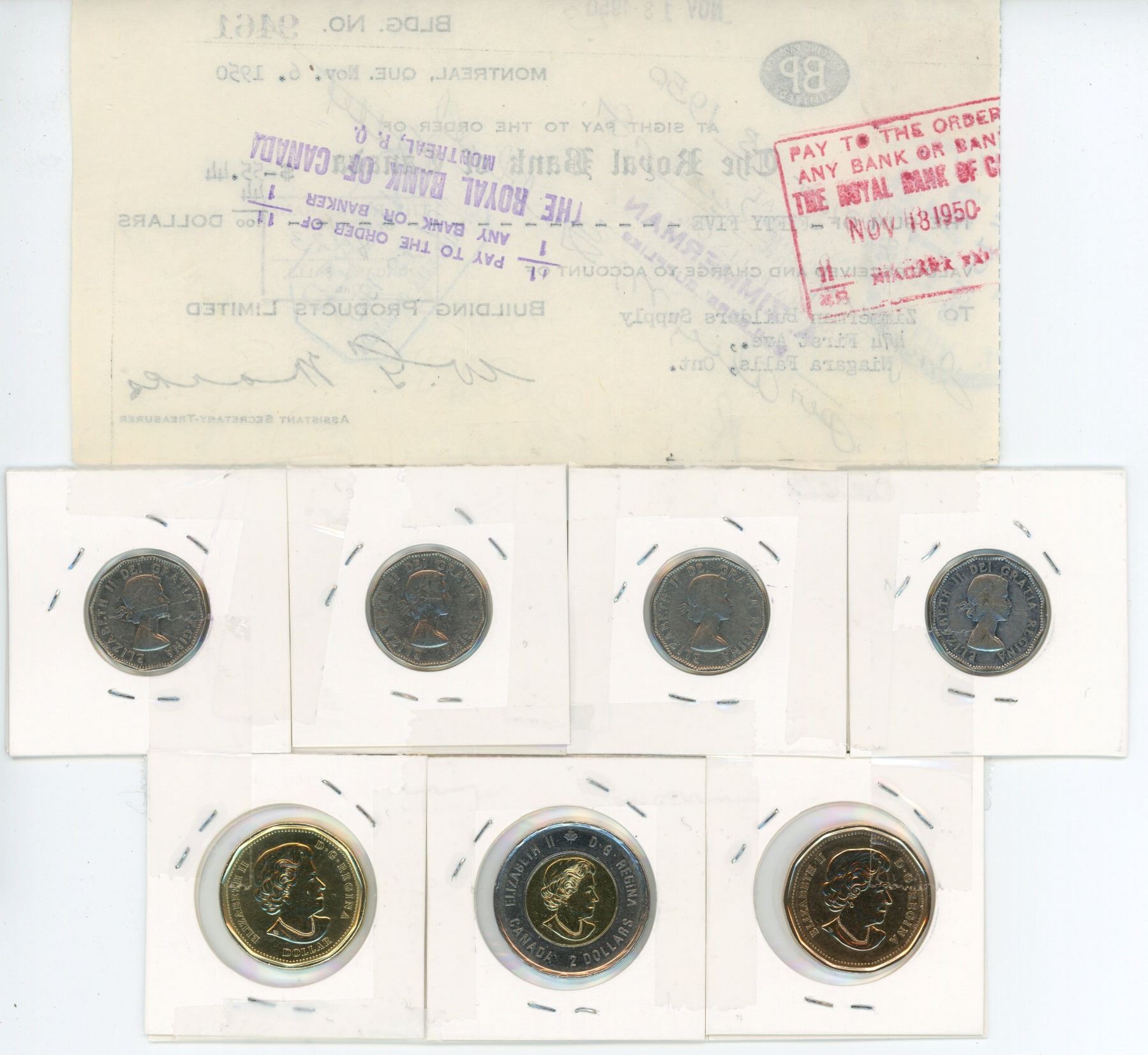 1950 Royal Bank of Canada cheque & 1954-1959 Canadian 5 cent coins, 2 various Canadian 1 dollar coins and 1 Toonie