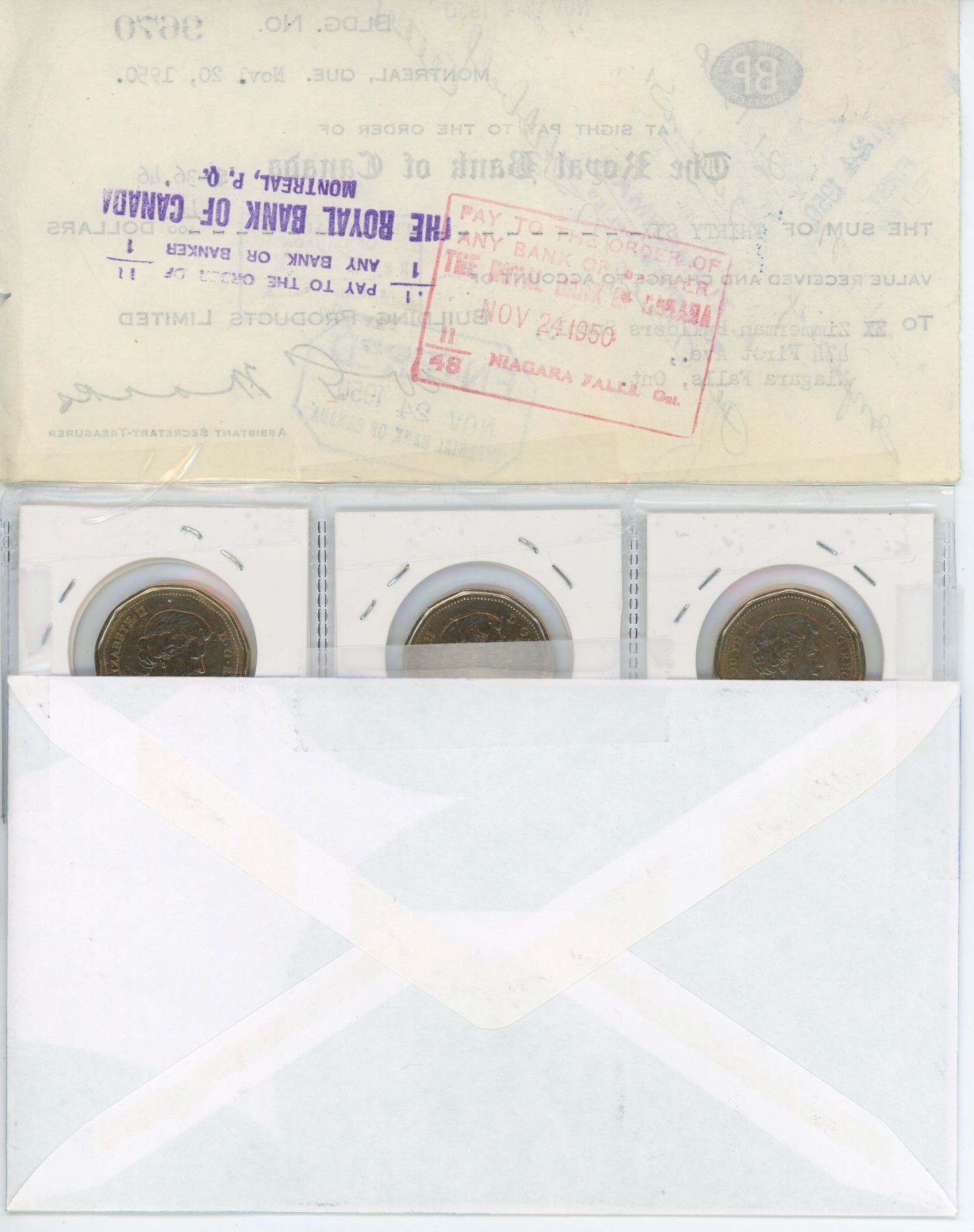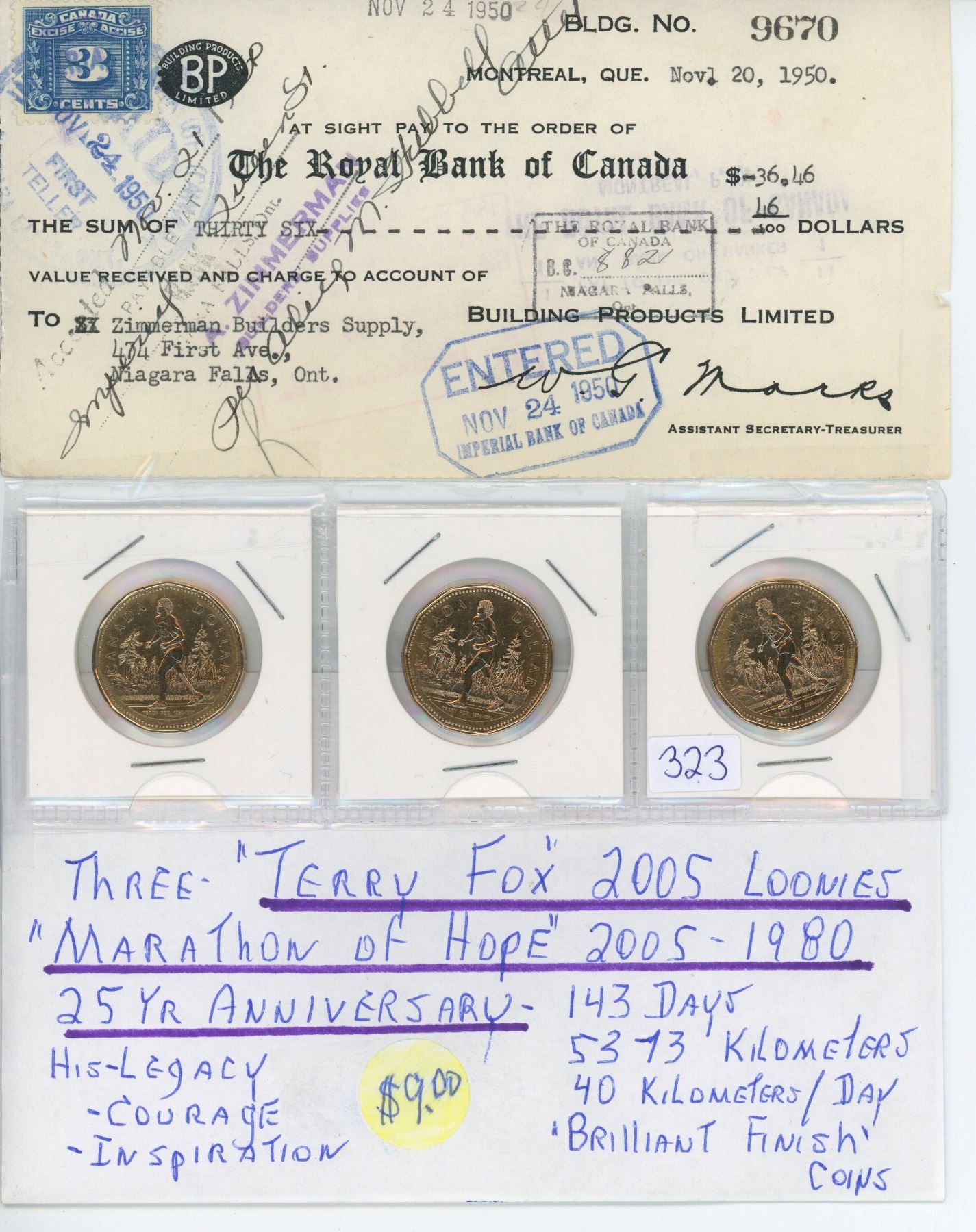 1950 Royal Bank of Canada cheque & 3 "Terry Fox" Canadian loonies - 1980-2005