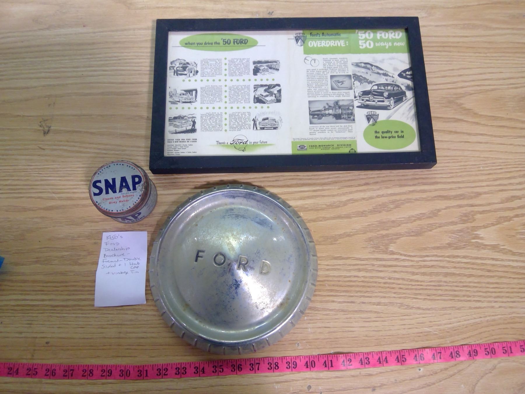 1950's Ford Dealership Brochure - Framed - Double Sided - 1 Hubcap + Vintage Tin