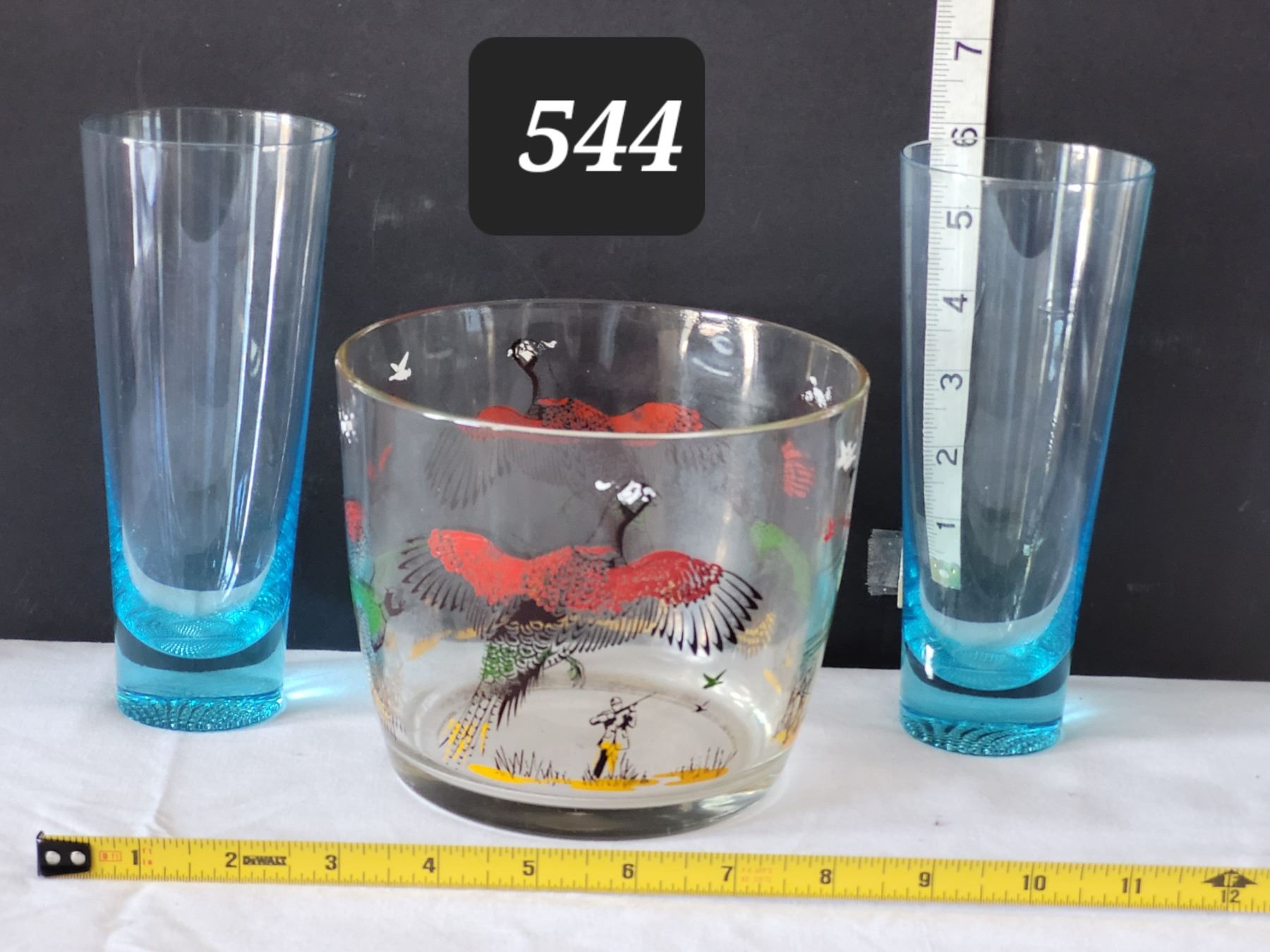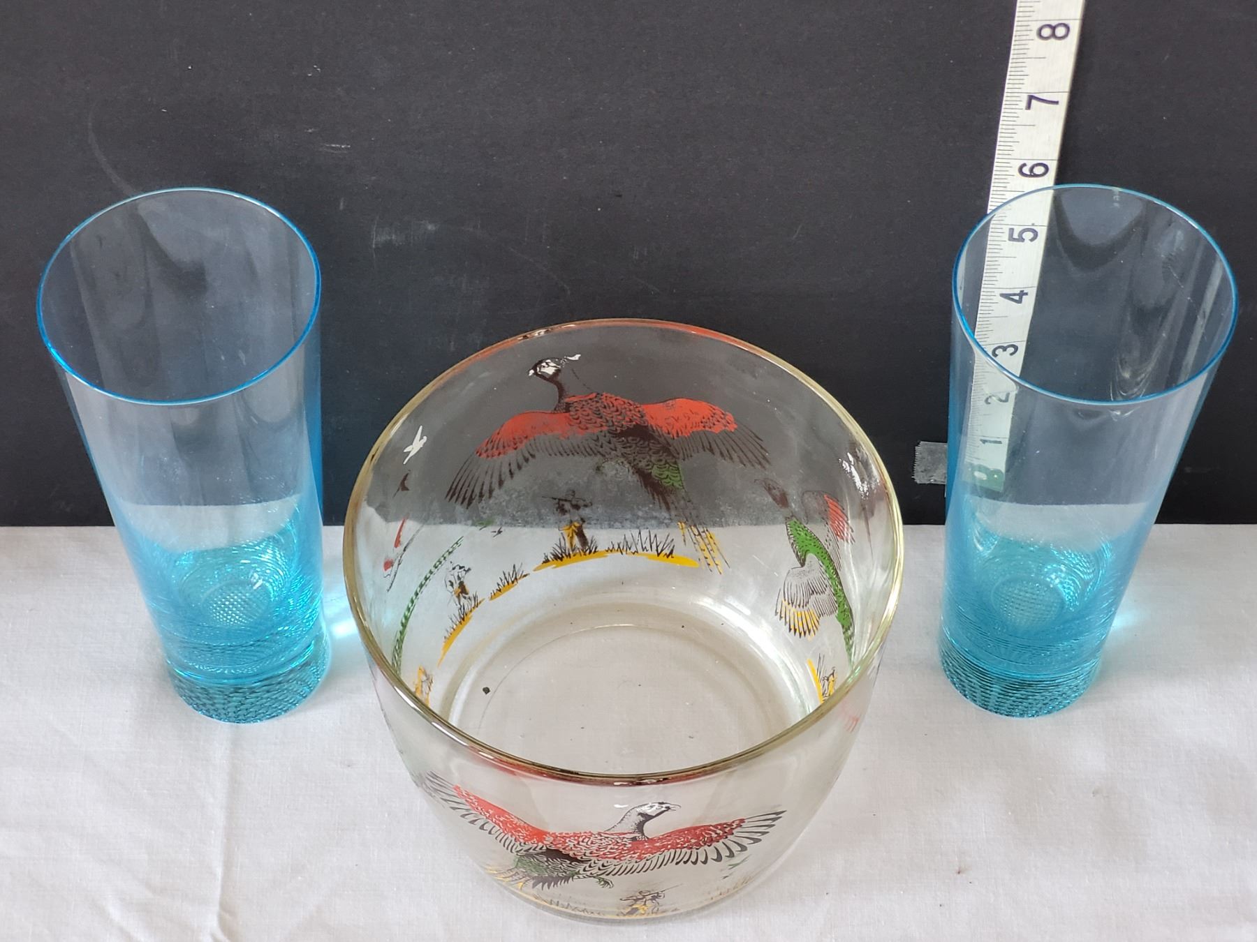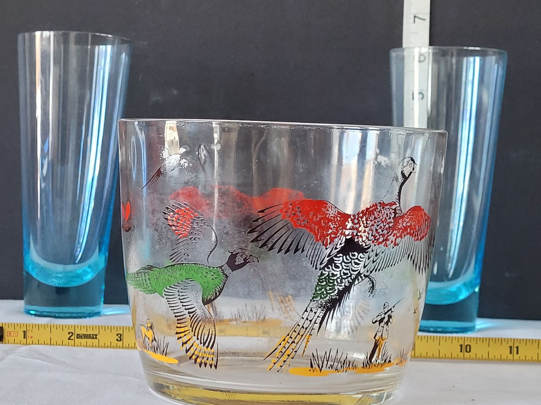 1950's Pheasant hunter ice bucket & aqua blue highball glasses.