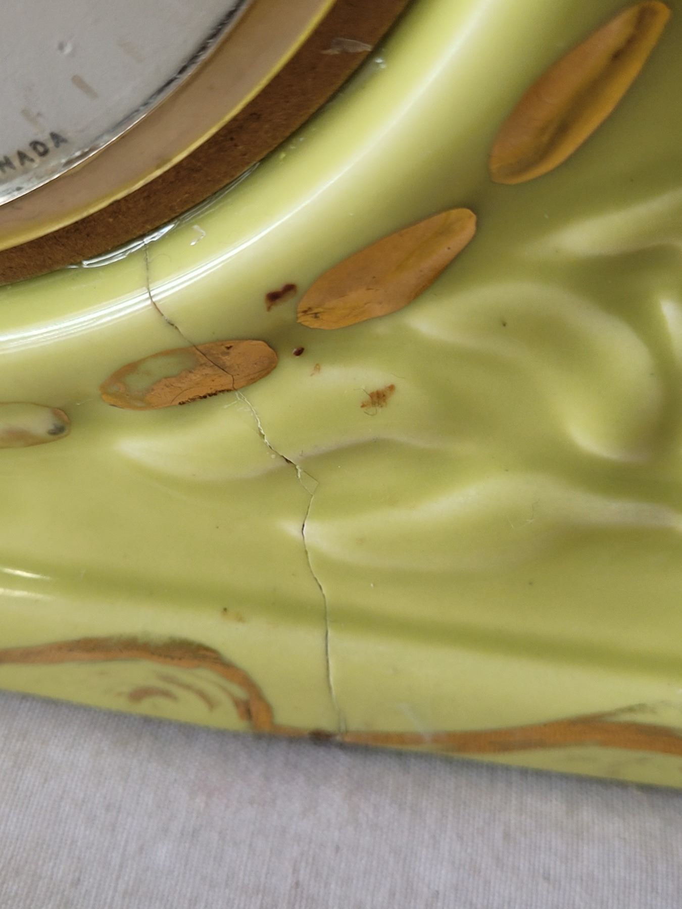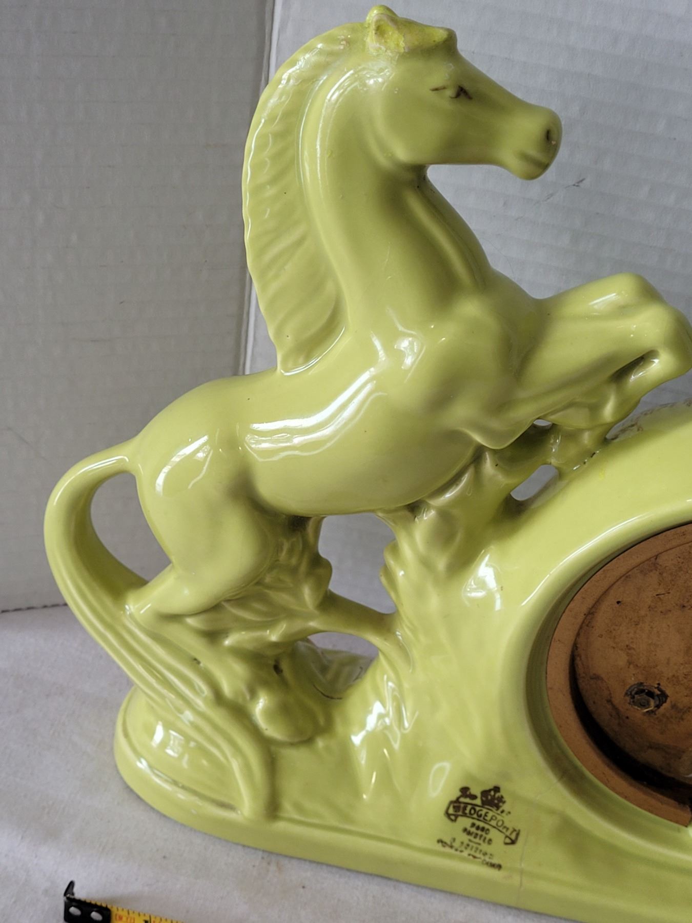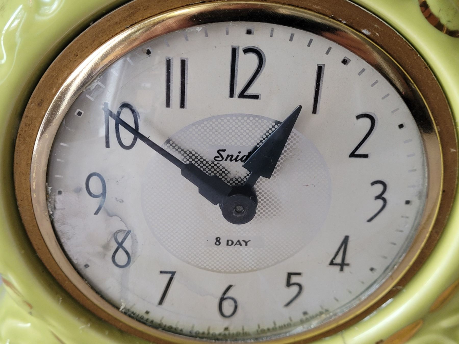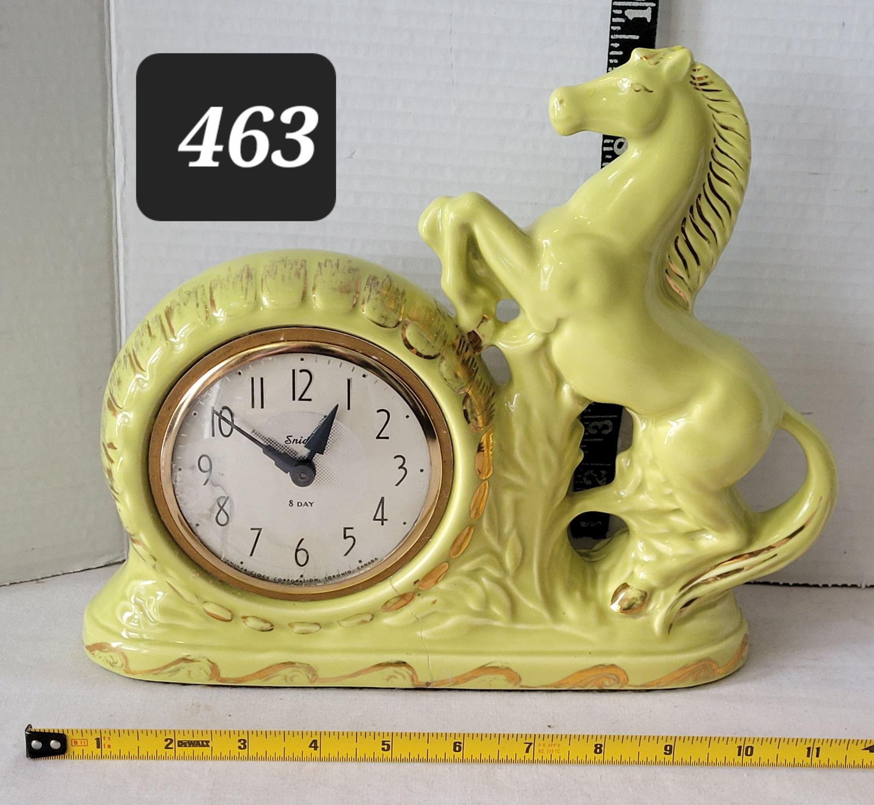 1950's Snider 8 day horse clock. Green enameled ceramic housing. Wedge point , hand painted, Manual wind (Hairline crack)