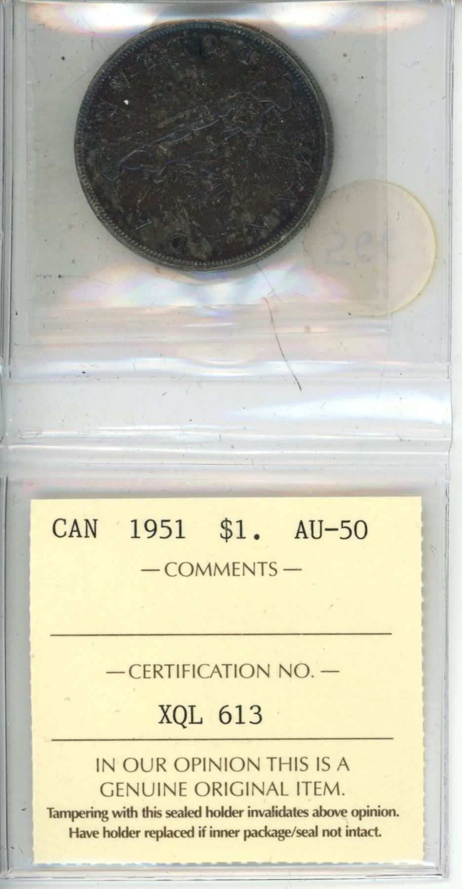 1951 Canada One Dollar - AU-50 - Silver - XQL 613 - ICCS.