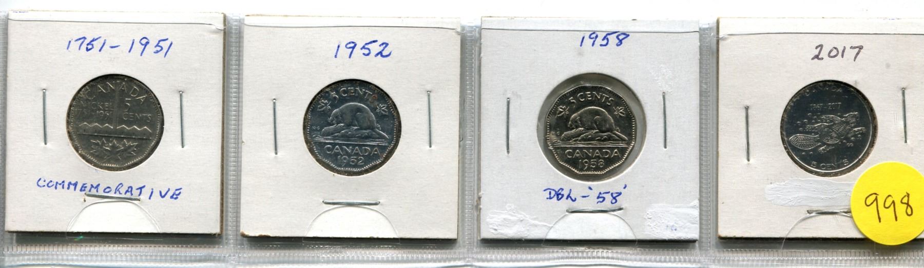 1951 Comm, 1952, 1958 Dbl "58", 2017 Five Cent Coins