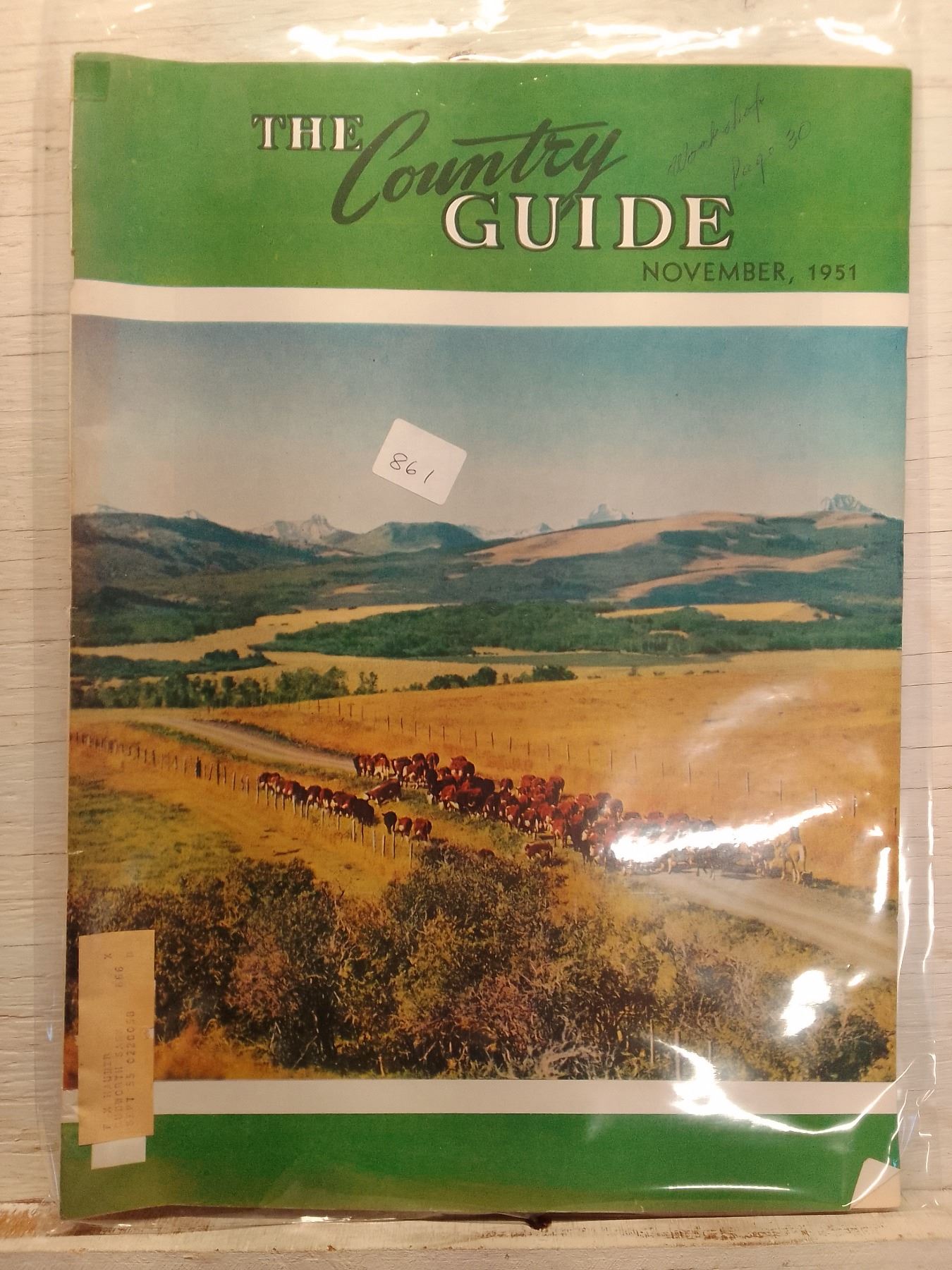 1951 Country Guide Cover: Cowboy Herding Cattle on Prairie Road- The Country Guide is a long-running Canadian farm magazine, evolving from The Grain Growers' Guide (renamed in 1928) and merging with The Nor'-West Farmer in 1936. By the 1950s, it used a simplified title while focusing on practical agriculture, rural life, and prairie farming. This November 1951 issue features a scenic photographic cover of a cowboy driving cattle along a rural road with mountains in the background. It remains published today as Country Guide, Canada's oldest farming magazine.
