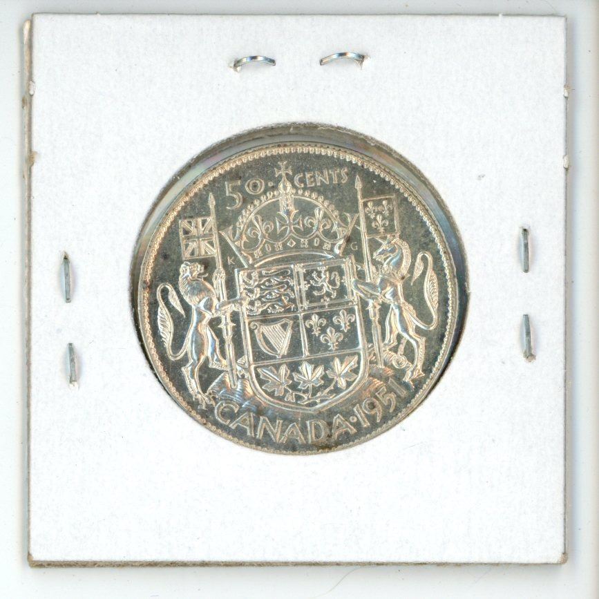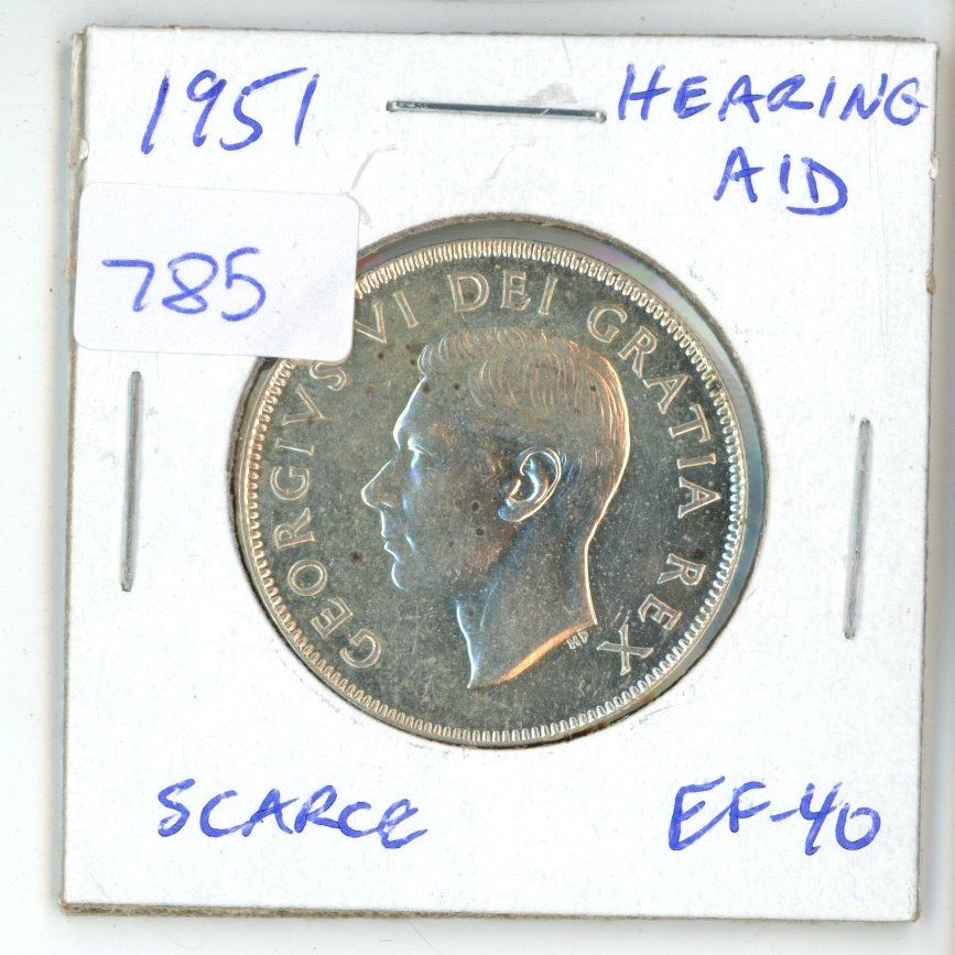 1951 Hearing Aid Canadian Silver 50 Cents. Hearing Aid in the king’s ear from a Die Clash. EF-40. Scarce.