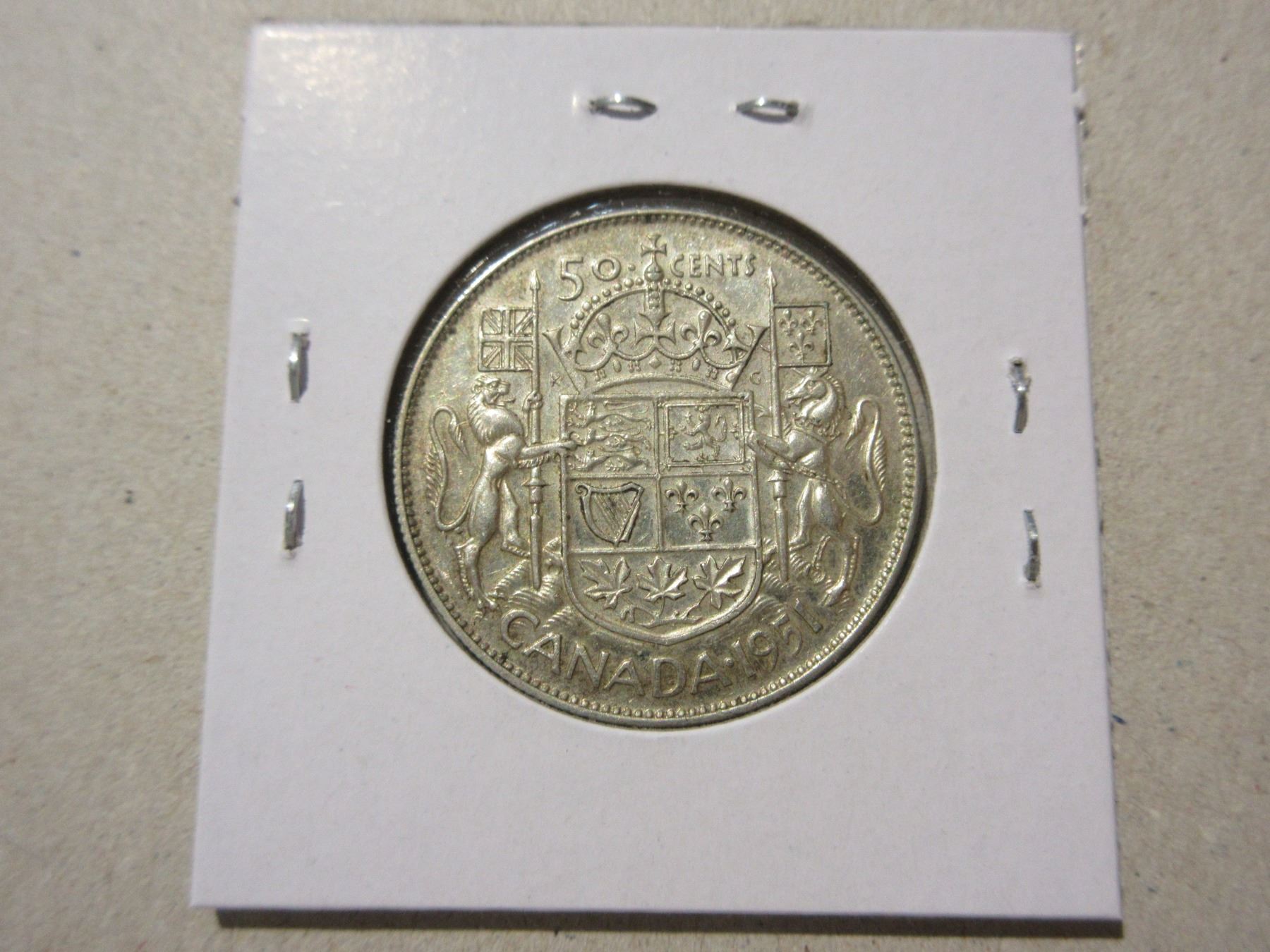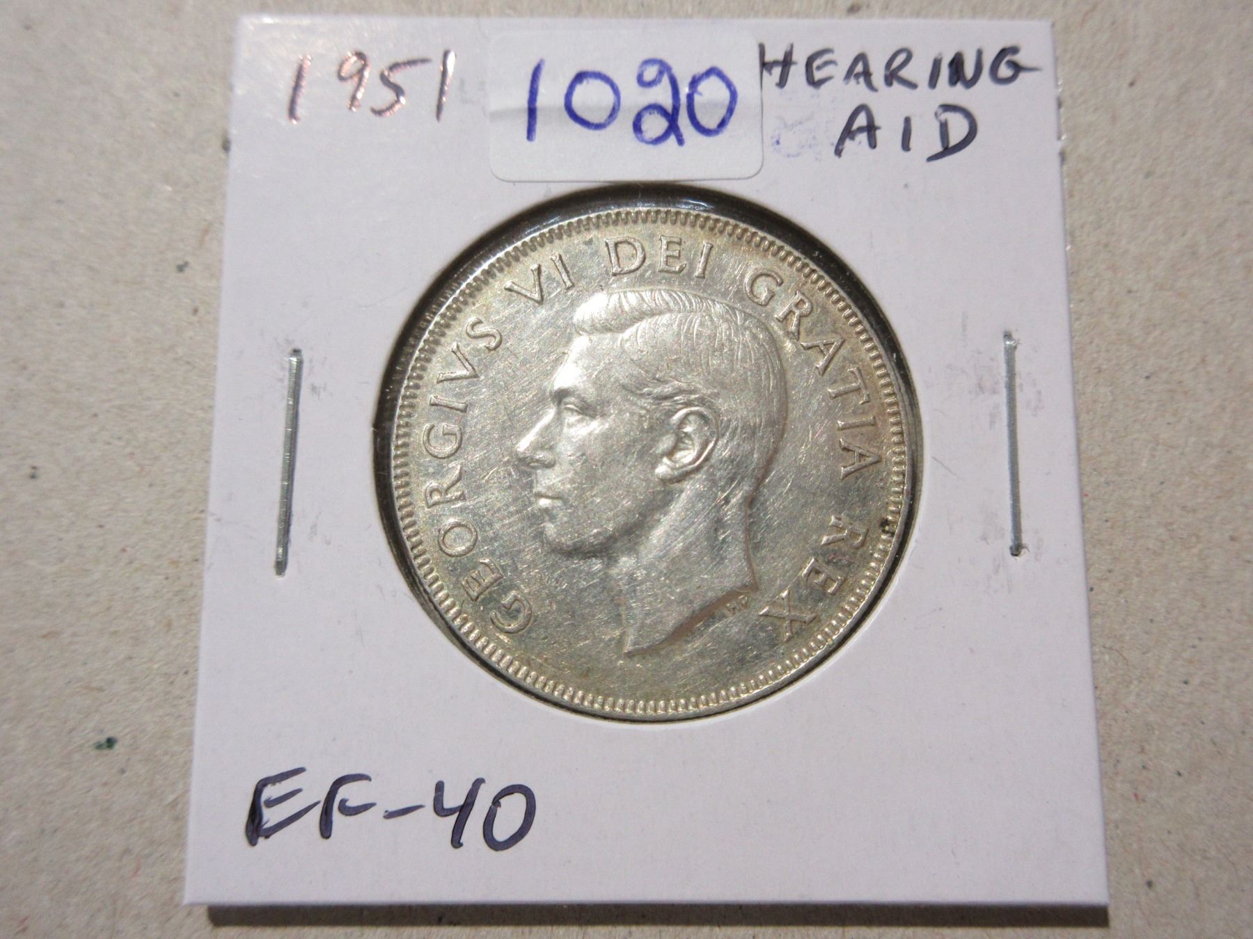 1951 Hearing Aid Silver 50 Cents. The Hearing Aid in the king’s ear is due to a Die Clash. EF-40. Scarce.
