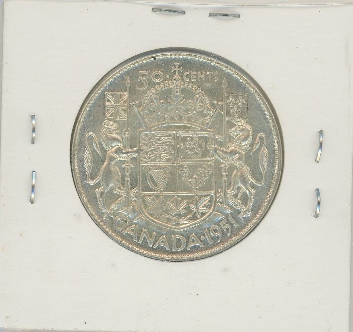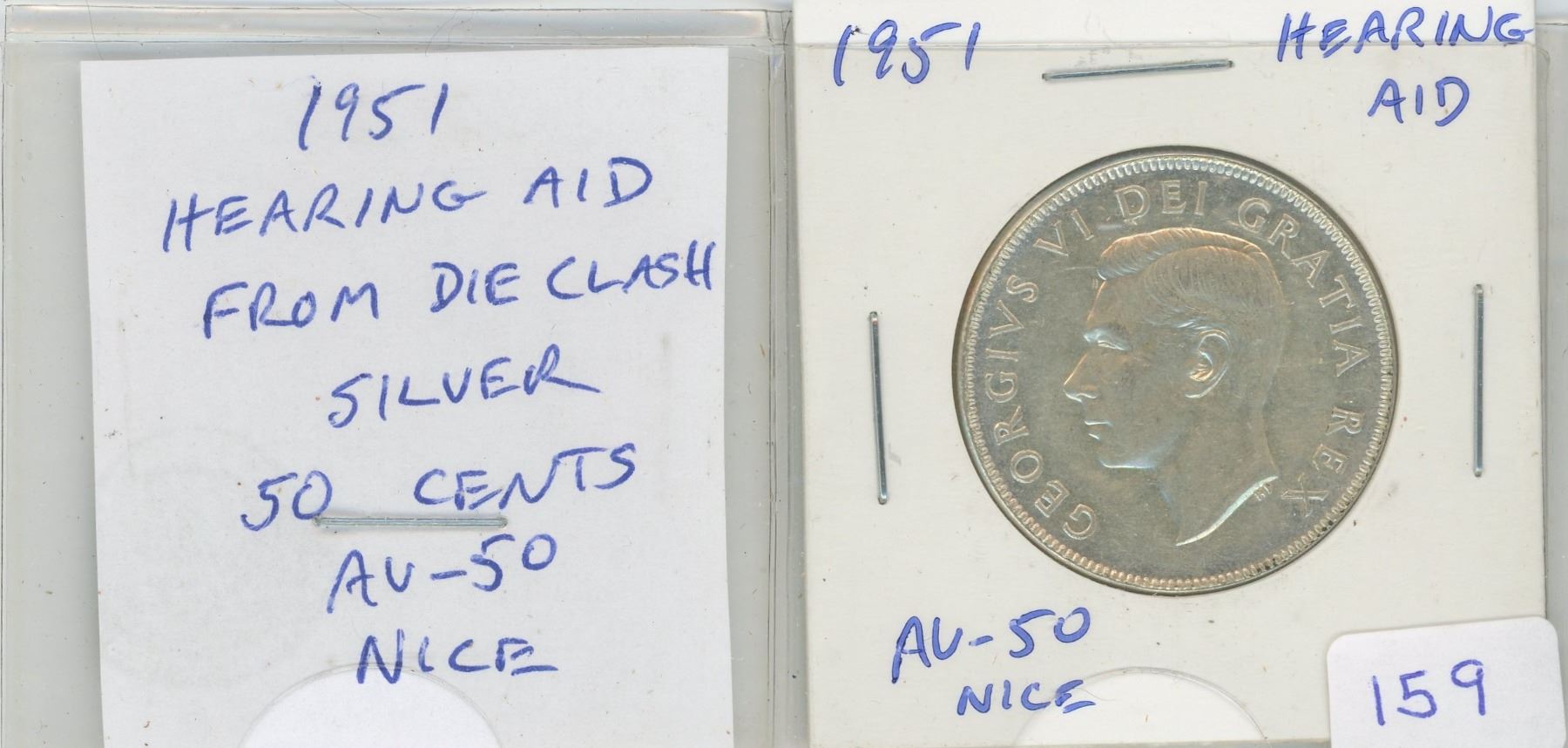 1951 Hearing Aid Silver 50 Cents. The king has a Hearing Aid, the result of a Die Clash. A scarce variety. AU-50. Nice.