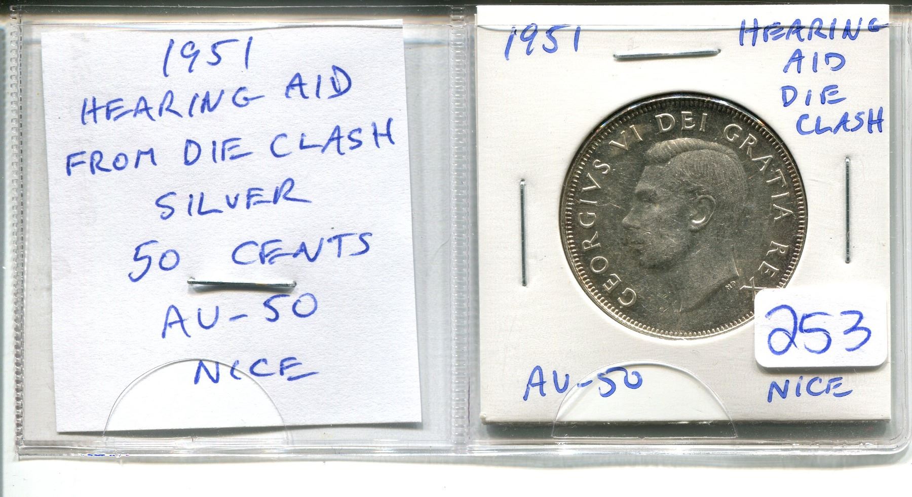 1951 Hearing Aid Silver 50 cents. Hearing Aid in the king’s ear from a Die Clash. An interesting and scarce variety. AU-50. Nice.