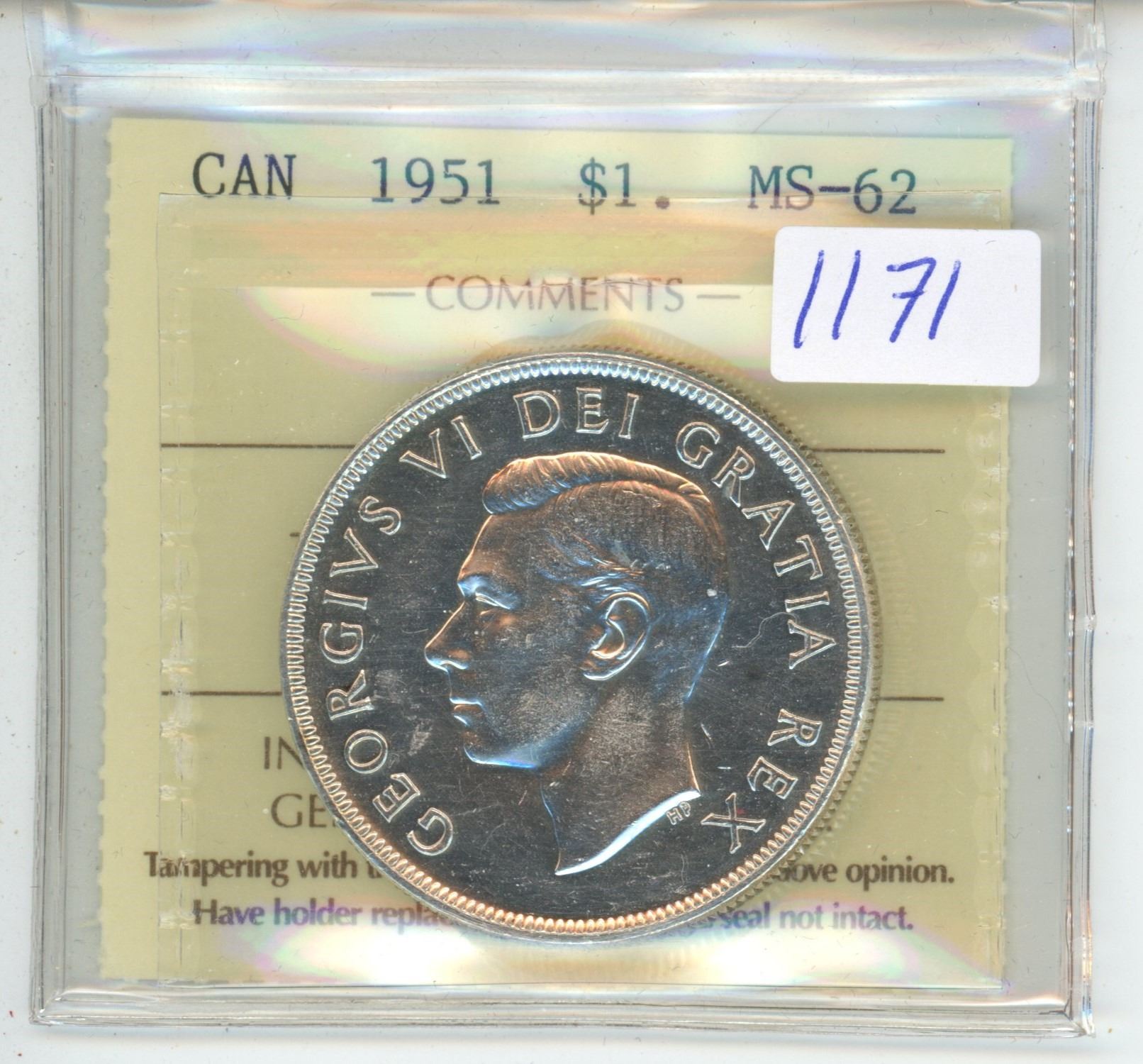 1951 ICCS Graded, Canadian voyageur silver dollar - MS62