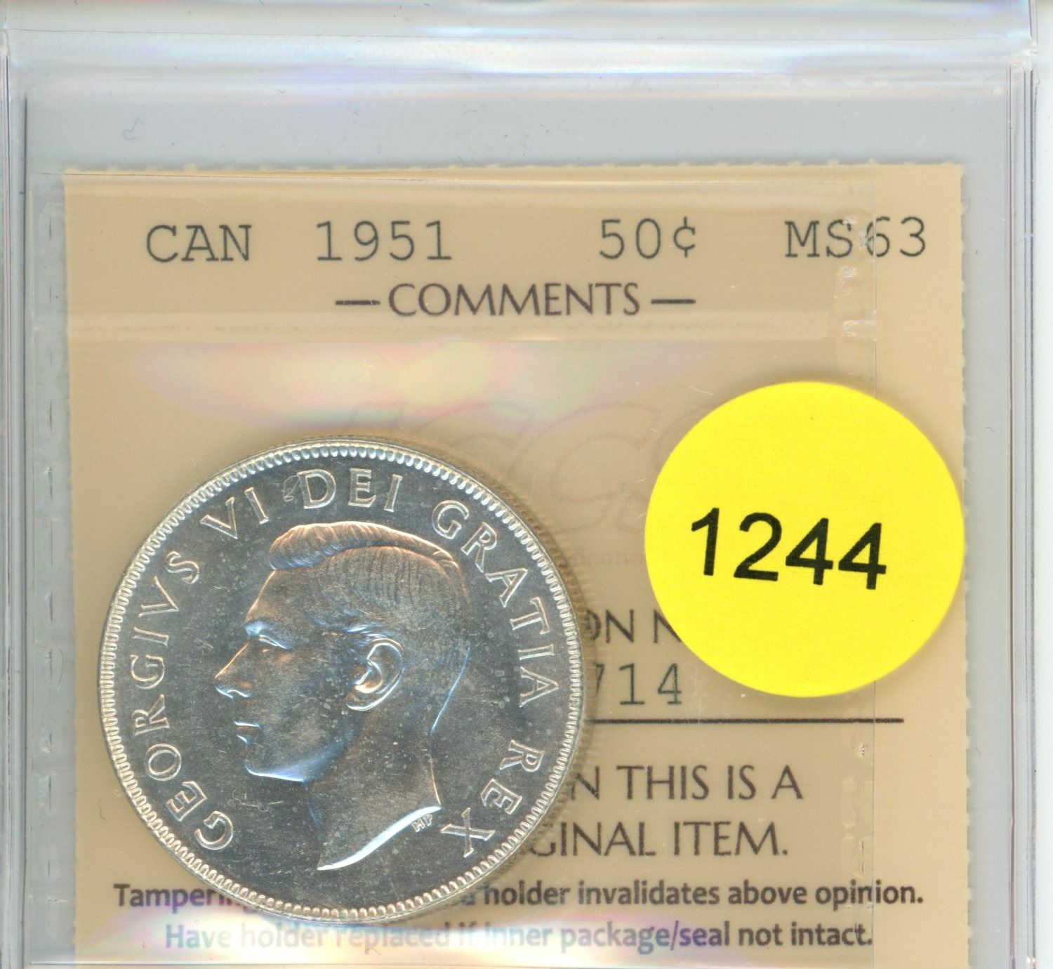 1951 MS63 ICCS Graded Canadian Fifty Cent Coin